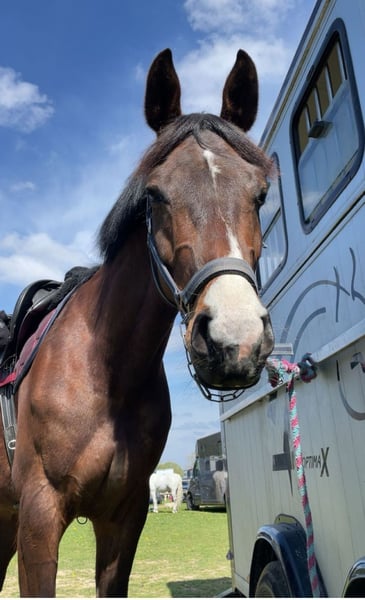 Spunky mare, cautious on cross-country, experience up to 4 feet (120 cm), no stable vices, loads easily, well-behaved with farrier, experienced rider required