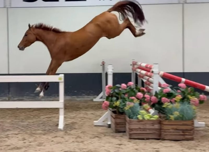 For sale is a stunning 4-year-old chestnut mare with a very sweet, affectionate temperament. She has recently been gently backed and consistently demonstrates motivation, willingness to learn, and nerves of steel. With a promising jumping pedigree and dressage lineage on her dam’s side, she possesses excellent prerequisites for competition. Her three basic gaits are rhythmical and showcase particular elasticity and expression. She currently measures approximately 16.2 hh and is still growing. In daily handling, she proves to be uncomplicated, people-oriented, and curious – a truly reliable partner with charm and potential. Ideal for ambitious riders seeking a young horse with great potential for jumping, dressage, or versatile use.