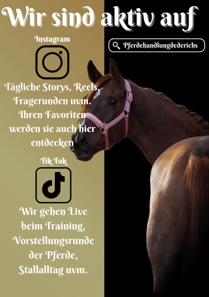 IM KUNDENAUFTRAG- Pferd steht nicht bei uns vor Ort, sondern in 92348 Berg Utopia ist eine SBS - Beglisches Sportpferd, Stute geboren 2020 ca. 1,62-1,64 cm v. First Step Valentin, Vitalis, Vivaldi, Florestan, Ferro *Utopia* bildschöne und super coole Stute mit tollen Bewegungen. Utopia ist Dressurpferde A fertig, geht schön in der Bahn und ist super cool und unerschrocken. Sie ist rittig, nicht hitzig und macht nur Freude. Im Gelände alleine oder in der Gruppe super nervenstark und mutig. Springt auch brav über Baumstämme. Eine wahre Allrounderin für Sport und Freizeit. Straßenverkehr, Lärm, Planen usw. nimmt sie völlig gelassen !!! SCHAUEN SIE SICH UNBEDINGT IHR VIDEO AN !!! Im Umgang super verschmust und lieb. Sie bringt bereits eine große AKU mit. Dieses Bilderbuch-Pferd sollte man nicht verpassen. Im Kundenauftrag, wegen Zeitmangel. Pferd steht nicht bei uns vor Ort, sondern in 92348 Berg Ein aktuelles Video finden Sie hier in der Anzeige oder unter folgendem Link: https://www.youtube.com/watch?v=0MCMNQpEuik Pferdehandlung Dederichs – Ihr Partner für den Pferdekauf Kontakt & Erreichbarkeit: Anfragen bitte ausschließlich telefonisch unter 0173/9792139 Montag – Freitag: 09:00 – 18:00 Uhr Samstag: 09:00 – 15:00 Uhr Sonntag: Ruhetag Folgen Sie uns auf Social Media! Erleben Sie unseren Alltag mit den Verkaufspferden auf Instagram, TikTok & Facebook unter Pferdehandlung Dederichs Probereiten & Vorführen: • Probereiten: 40€ • Feiertage: Proberitt 50 € • Vorführung durch Bereiter: 30 € (Vorreiten, Bodenarbeit etc.) • Wir unterstützen Sie auch gerne beim Transport ins neue Zuhause • Beschreibungen sind subjektive Einschätzungen des Verkäufers und keine zugesicherten Eigenschaften