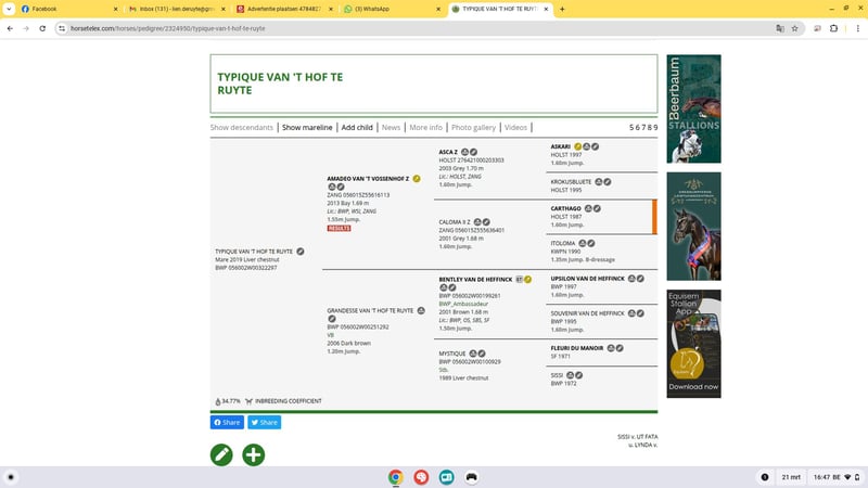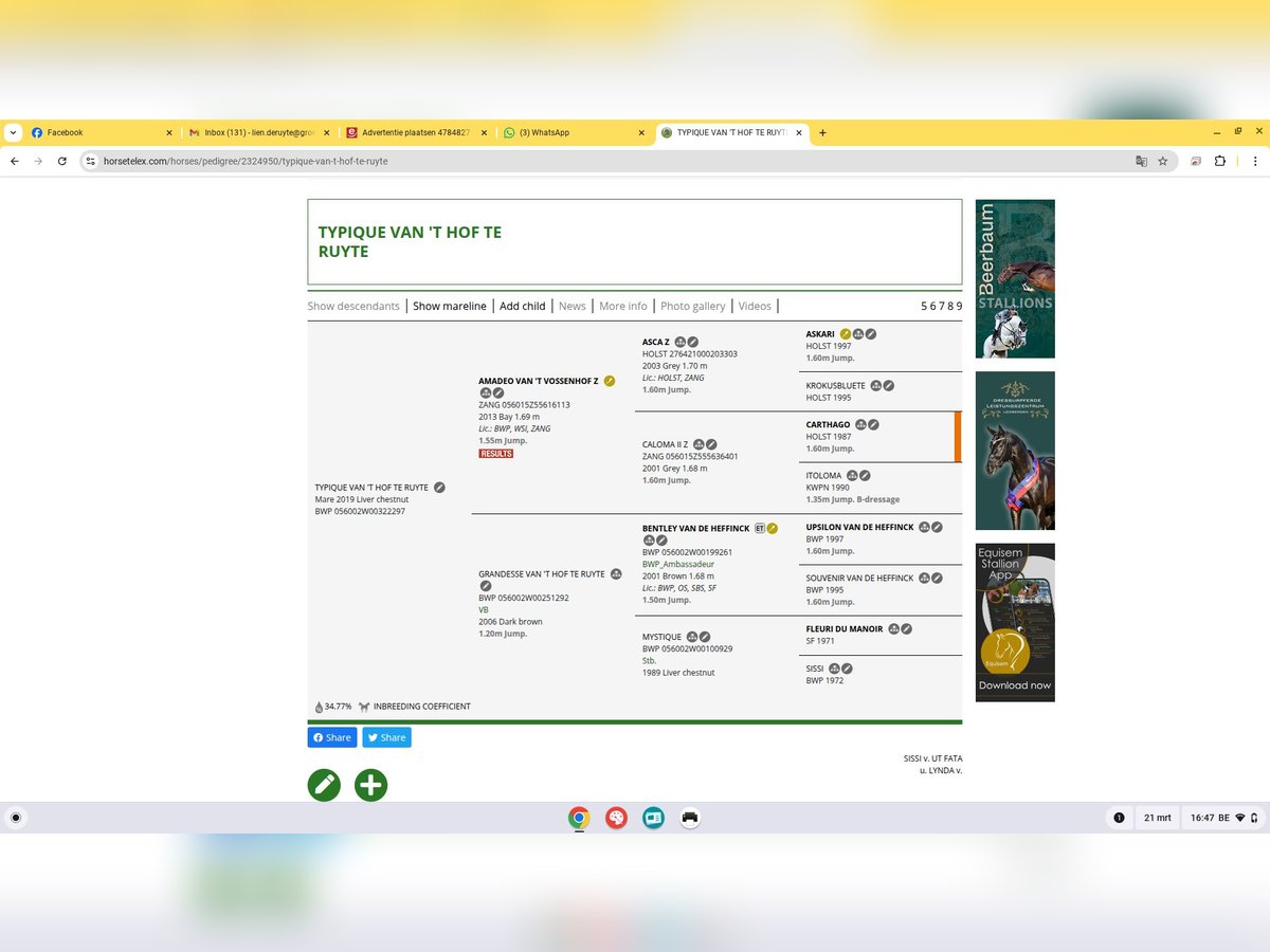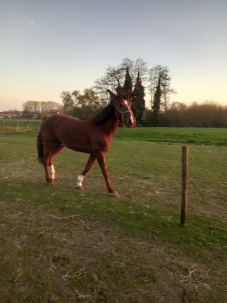Te koop: 7-jarige merrie met topbloed – interessant voor dressuur, recreatie en fokkerij Deze 7-jarige merrie beschikt over een uitzonderlijke afstamming uit de BWP-prestatiestam 121, een stam die reeds meerdere internationale springpaarden heeft voortgebracht, waaronder Saphir (1.60m) en Mic Mac du Dieu Demon (1.50m). Afstamming: Amadeo van het Vossenhof x Bentley van de Heffinck x Fleuri du Manoir Ook langs moederszijde is er bewezen kwaliteit aanwezig: haar moeder sprong op niveau Zwaar LRV (±1.30m). In de omgang is deze merrie een echte schat: ze is zeer braaf, betrouwbaar en makkelijk in de hand. Zowel op wandeling als tijdens dressuurwerk toont ze zich werkwillig, rustig en aangenaam te rijden. Bij het springen is ze momenteel nog wat onstuimig en heeft ze verdere, consequente training nodig. Door tijdsgebrek kunnen wij haar hierin helaas niet voldoende begeleiden om haar springcapaciteiten volledig tot hun recht te laten komen. Wij zien voor haar dan ook vooral een mooie toekomst als: dressuurpaard recreatie-/wandelpaard kweekmerrie (gezien haar sterke en bewezen bloedlijn) Kortom, een eerlijke merrie met veel potentieel voor de juiste ruiter of fokker. Voor meer info of een bezoek, neem gerust contact op.