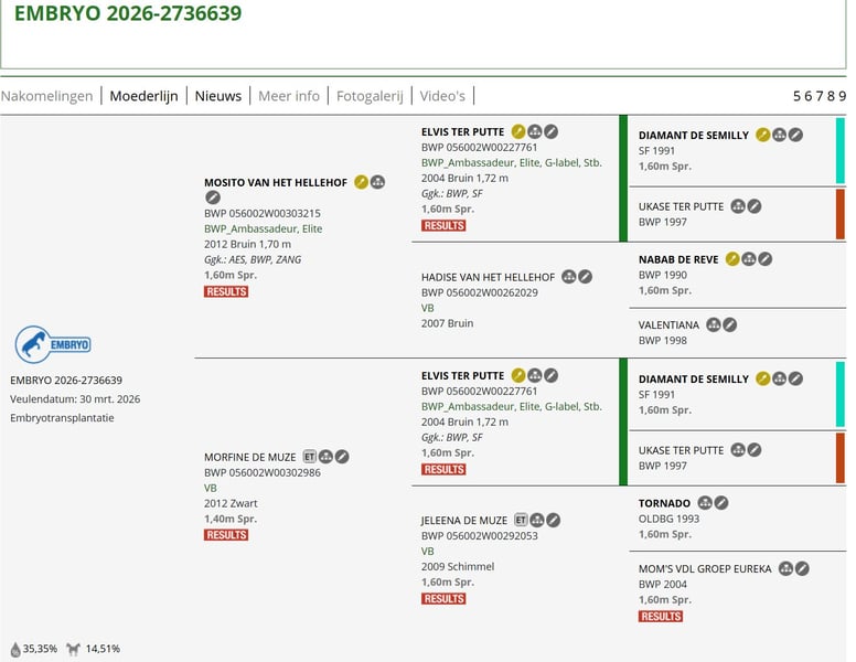 Are you looking for a future Grand Prix horse from the absolute best female lines in the world? Later this month, a full sibling of the international star Qnokke de Muze will be born! Genetic Perfection This foal is not just a product of careful breeding; it is a genetic masterpiece from one of the most successful 1.60m lines of our time: Sire: Mosito van het Hellehof (1.60m) – A sensation in recent years. He passes on incredible reflexes, strength, and an outstanding work ethic to his offspring. Dam: Morfine de Muze – Daughter of the legendary stallion Elvis ter Putte (1.60m). She is the key to the success of this combination. Direct maternal line: Mom’s Eureka de Muze (1.60m): The dam’s pedigree is a culmination of achievements at the 1.60m level. With renowned ancestors such as Jeleena de Muze (1.60m), Mom’s Eureka de Muze (1.60m) (Maikel van der Vleuten), and the great-granddam Qerly Chin (1.60m), success is almost guaranteed. Key information: - Proven pedigree: Full sibling of the successful 1.60m horse Qnokke de Muze (competing at the highest international level). - Top-level 1.60m line: Every generation in this pedigree has proven itself in sport at the highest level. Estimated date of birth: around March 30, 2026 Method: Embryo transfer Invest in the future Whether you are looking for a prospect for a stallion, an exceptional mare for breeding, or a future Grand Prix winner – this foal meets all criteria. Such an opportunity, directly from the Eureka de Muze line, is rarely available on the market.