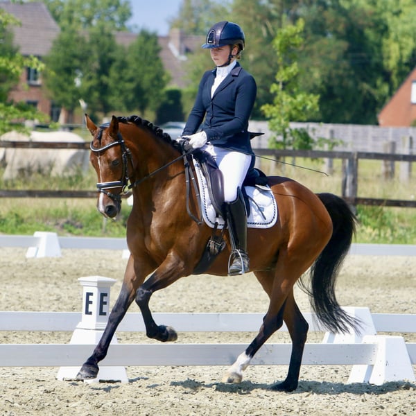 Very easy to ride schoolmaster. At 6 years old, he has a bright career ahead of him, but he can already be a true schoolmaster. He has been trained since the age of 4 by a small adult. He knows all FEI exercises and has extensive competition experience with good results. Winner of the Belgian Cup for 5-year-old ponies. His father is a Light Tour dressage horse, combined with a small mare, giving him the qualities of a large horse in a pony. He is also very easy and sweet in handling.