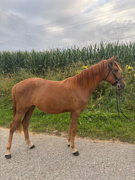 Diese Stute ist 135cm groß. Ihre Charakter können wir beschreiben als pflegeleicht ,brav und nicht schreckhaft . Kennt 4GGA und kann gehen auch alleine ausreiten. Wird vorbereitet für Springturnier . Sie ist noch am Anfang seines Ausbildung aber sehr talentiert. Kennt Hufschmied und steigt im jede Anhänger ein.TÜV kann gerne gemacht werden. Im gemischte Herde hat kein Problem. Für weitere Fragen bitte melden