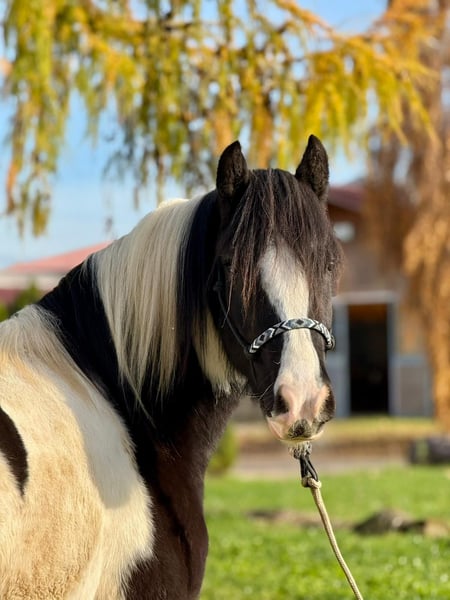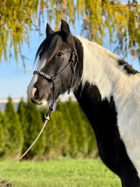 Donald ist ein 4-jähriger Irish Cob mit einem aktuellen Stockmaß von ca. 1,53 m. Er befindet sich in der Ausbildung und ist angeritten. Im Schritt und Trab zeigt er sich bereits sicher und gelassen. Donald bringt eine kleine AKU ohne Befund mit, ist verladefromm sowie schmiedefromm und im täglichen Umgang unkompliziert. Er kennt Bodenarbeit und Gelassenheitstraining und zeigt sich dabei aufmerksam und lernwillig. Charakterlich ist Donald ein Pferd, das durch seine offene und freundliche Art überzeugt. Er ist neugierig, beobachtet seine Umwelt aufmerksam und geht neuen Situationen interessiert entgegen. Menschen gegenüber zeigt er sich sehr zugewandt, sucht den Kontakt und genießt jede Form von Zuwendung, ohne dabei aufdringlich zu sein. Insgesamt wirkt er ausgeglichen, ehrlich und angenehm im Umgang – ein Pferd, das gerne mitarbeitet und seinem Menschen vertraut. Donald eignet sich ideal für jemanden, der ein Pferd mit solidem Fundament sucht und Freude daran hat, die weitere Ausbildung gemeinsam zu gestalten. Gerne kann Donald nach dem Kauf bei uns zur weiteren Ausbildung bleiben. In Verbindung mit begleitendem Reitunterricht besteht die Möglichkeit, dass Pferd und neuer Besitzer Schritt für Schritt zusammenwachsen und sich gemeinsam weiterentwickeln – in ruhiger Atmosphäre und mit individueller Betreuung. Ein Pferd für Menschen, die Wert auf Charakter, Ruhe und eine saubere Ausbildung legen. Bei Interesse melden Sie sich gerne unter der 0160-5482960 (auch via WhatsApp erreichbar).