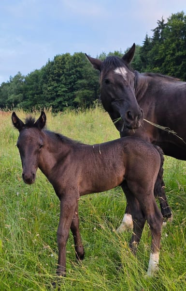 For sale is a stunning Criollo mare, born in 2020. This elegant black mare is characterized by her strong conformation and friendly temperament. She is ideally suited for breeding and offers great potential for ambitious breeders. This year, she foaled a healthy colt by our La Esperanza Palisandro. This little gentleman is a dream in black and has a heart of gold. Her first foal was sired by our Surrender and is a beautiful black and white pinto mare, which will later enrich our breeding program. She is currently pregnant by our Surrender! Two horses for the price of one! If you are interested or have any further questions, please feel free to contact me. Viewings are available by appointment.
