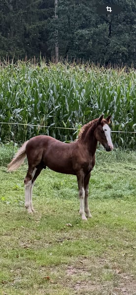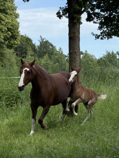 Davino is special because he has a thumbs-up mark on his forehead. He is typy and strongly built, already well-muscled, and will cover his rider well in all disciplines. His father is Donatello vom HS Corral, and his mother is Anchuna HS, who is descended from the elite stallion Negro Nostalgioso and has been living with me as a family member since weaning. Davino is still growing up naturally in the herd in a loose housing system, but he is already familiar with everyday things like people, dogs, tractors, cars, yard loaders, scooters, etc. My horses do not know boxes, and I wish for them to continue living in a loose housing system with herd connection. He has already started to play alone with his friend and is becoming more confident and curious every day. Weaning is possible at the earliest in October. He could move out at the earliest in November. We would appreciate nice inquiries with a short info about the housing, plans, etc. If you have any questions, feel free to reach out.