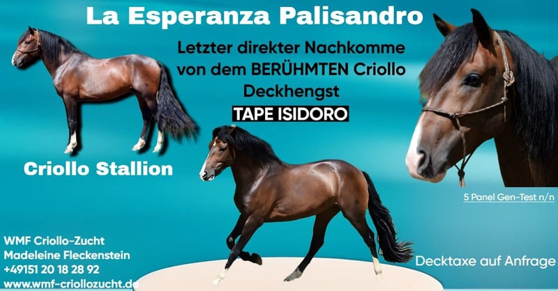 Verkaufe Criollo Hengst – Freizeitbegleiter mit Charme Zum Verkauf steht ein wunderschöner reinrassiger Criollo Hengst, geboren im Jahr 2025. Dieser elegante Rappe besticht durch sein freundliches Wesen und seine beeindruckende Erscheinung. Mit einem geschätzten Stockmaß von 150 cm ist er perfekt für Freizeitaktivitäten geeignet und zeigt viel Potenzial für den vielseitigen Einsatz. Der Hengst ist gesund, gut sozialisiert und wurde liebevoll aufgezogen. Er eignet sich hervorragend für Reiter, die einen zuverlässigen und charmanten Freizeitpartner suchen. Seine ruhige Art macht ihn auch für weniger erfahrene Reiter attraktiv. Er ist ein direkter Enkel des berühmten Tape Isidoro. Bei Interesse oder für weitere Informationen freuen wir uns auf Ihre Kontaktaufnahme. Ein Kennenlernen vor Ort ist selbstverständlich möglich.