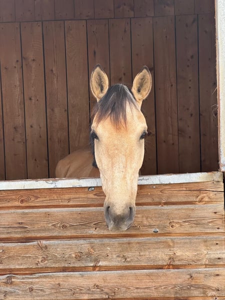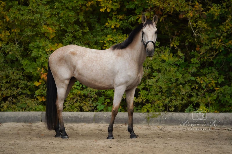 Hiermit suche ich ein neues Zuhause für Carpetana, eine hübsche Falbstute, geboren 2021, circa 1,50m groß. Capri wurde Anfang dieses Jahres aus Spanien importiert und kam vom Händler direkt roh zu uns. Gemeinsam haben wir mit ihr Bodenarbeit gemacht, sie angeritten und alle wichtigen ersten Schritte erarbeitet. Von Anfang an war sie dem Menschen sehr zugewandt, super brav und hat keinen falschen Schritt beim anreiten gemacht. Kennt kein Bocken oder Steigen. Die Überlegung war sie hier im Schulbetrieb einzusetzen, dafür ist sie meiner Meinung nach aber zu fein und hat doch vielleicht Potenzial für mehr. Nach einem halben Jahr kennt sie nun alle Grundgangarten unter dem Reiter, Stangenarbeit und sogar Ausritte in der Gruppe. Spazieren geht sie auch alleine und kleine Sprünge ohne Reiter haben wir ebenfalls mit ihr gemacht. Update: Heute hat sie das erste Mal Cavalettis mit Reiter gemacht und hatte sehr viel Spaß und einen angenehmen Zug zum Sprung! Kleine Sprünge macht sie inzwischen mit viel Freude. Sie hat ein gutes Go und freut sich über tägliche Arbeit. Je mehr man mit ihr macht, desto besser wird sie! Sie ist schmiedefromm und brav beim Tierarzt. Natürlich darf man nicht vergessen, dass sie erst 4 ist und damit nicht für Anfänger geeignet. Ein Reitvideo gibt es auf Anfrage. Für ein Probereiten nehme ich für den zeitlichen Aufwand 25€.