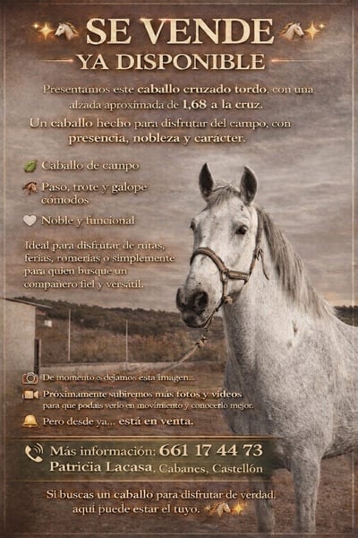 Caballo para disfrutar de el en ferias romerias y campo. Noble pero sensible para jinetes que buscan un amigo fiel