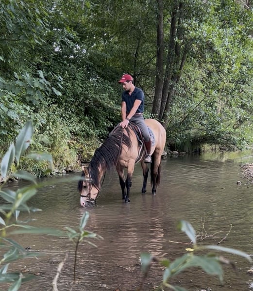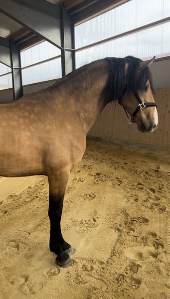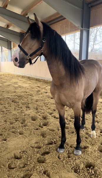 Zum Verkauf steht der 3,5 jährige Ca. 156 groß Andalusierwallach Artista. Optisch besticht er besonders mit seiner Farbe, seiner üppigen Mähne und vor allem seiner tollen Ausstrahlung. Auch charakterlich ist er ein absolutes Traumpferd. Er ist super lieb im Umgang, ausgeglichen und sehr menschenbezogen. Er wurde schonend angeritten, läuft in allen Gangarten brav sowohl in der Halle als auch im Gelände. Ausreiten kennt Artista alleine und in der Gruppe. Er zeigt sich dabei komplett unerschrocken und mutig, auf Neues geht er stets neugierig zu und hat keine Angst. Er ist absolut klar im Kopf und lässt sich nicht so leicht aus der Ruhe bringen. Dennoch hat er einen angenehmen Vorwärtsgang. Auch an der Longe und bei der Bodenarbeit beweist er, wie schnell er lernt und wie viel Spaß er an der Zusammenarbeit hat. Mit der Freiarbeit haben wir auch begonnen. Daran hat er viel Freude und orientiert sich sehr an seinem Menschen. Artista wurde auch bereits von Kindern an der Longe und frei in der Halle geritten und hat das super brav gemacht. Mit seiner Ausgeglichenheit, Lernbereitschaft und seinem ehrlichen Wesen bringt er die idealen Voraussetzungen als Freizeitpartner mit. Bei Interesse gerne melden, dann können weitere Fotos/ Videos gesendet werden oder ein Kennenlernen vereinbart werden.