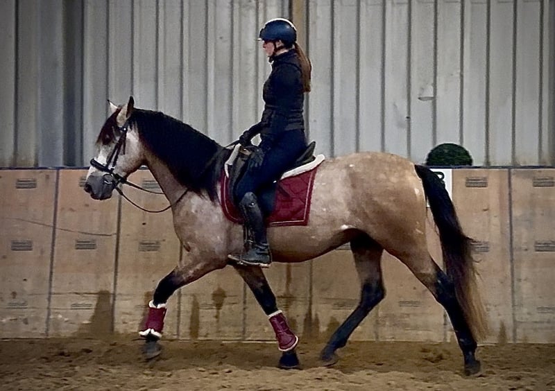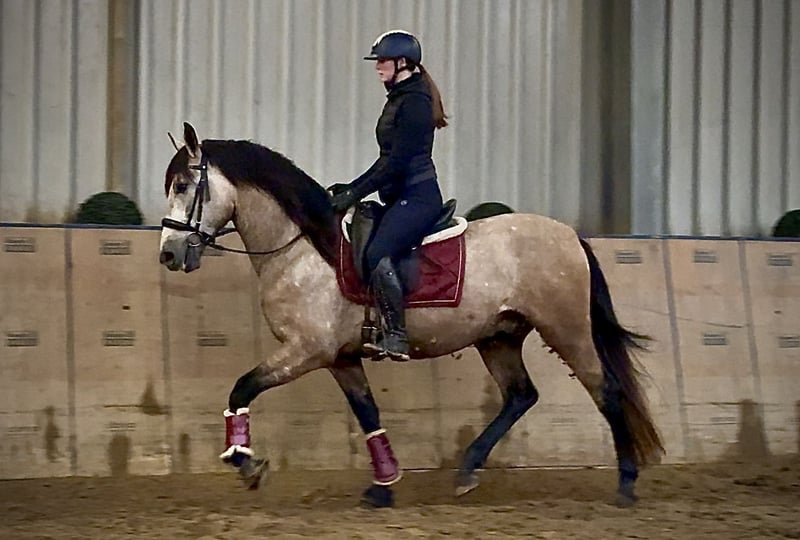 Name: Choto Rasse: Andalusier Mix Geschlecht: Wallach Geburtsdatum: 21.06.2021 Alter: 4 Stockmaß: 1.58m Farbe: Falbschimmel Abstammung: nicht bekannt Charakter: lernwillig, verlässlich, neugierig, intelligent, sensibel Ausbildung/Eignung: geritten, Dressur, Freizeit, Working Equitation Geländeerfahrung: zuverlässig, unerschrocken, alleine und in der Gruppe Gesundheit: entwurmt, geimpft, Barhufer, ekzemfrei, Zähne kontrolliert, ostheopatisch behandelt Haltung: Box, Offenstall Besonderheiten: sehr sitzbequem, schmiede und verladefromm Die genannten Eigenschaften beruhen auf unserer persönlichen Einschätzung und stellen keine zugesicherten Merkmale dar. Preis: 7900€ (Bruttopreis) Haben wir ihr Interesse geweckt? Um Ihnen einen besseren Eindruck von Choto zu geben, senden wir Ihnen sehr gerne sein Reitvideo zu. Selbstverständlich stehen wir Ihnen für eine ausführliche Beschreibung des Pferdes, persönliche Beratung und zur Beantwortung aller Ihrer Fragen auch telefonisch zur Verfügung. Bitte schreiben Sie uns hierfür jederzeit eine WhatsApp Nachricht, oder rufen unter folgender Telefonnummer an: +49 15119487595 Unsere Telefonzeiten sind täglich von 7:00 - 13:30 sowie ab 20:00Uhr. Wir freuen uns über Ihre Kontaktaufnahme! Eine klinische oder Röntgenologische Ankaufsuntersuchung kann gerne vom Tierarzt Ihrer Wahl durchgeführt werden. Natürlich kann Choto sicher und komfortabel in sein neues Zuhause geliefert werden. Wir kümmern uns um alle notwendigen Vorbereitungen und den Transport, damit Ihr neues Pferd stressfrei, gut betreut, versichert und wohlbehalten im neuen Zuhause ankommt. Zurzeit präsentieren wir eine sorgfältig ausgewählte Vielfalt an Verkaufspferden. Bei uns finden Sie garantiert Ihr Traumpferd. Besuchen Sie uns auch gerne auf unserer Homepage unter: www.marvinsroyalhorses.de. Sehr geehrte Kunden, gerne stellen wir Ihnen unsere Pferde vor und führen, putzen, satteln, longieren, Bodenarbeit sowie Probereiten in der Reithalle, auf dem Platz oder im Gelände ist Ihnen möglich, um Ihr neues Familienmitglied näher kennenzulernen. Dieses kostet für ein Pferd 40€, für jedes weitere 30€ und wird beim Kauf wieder erstattet. Unsere Adresse lautet: Grube Ferdinand 50 53577 Neustadt Wied Google Maps: marvinsroyalhorses