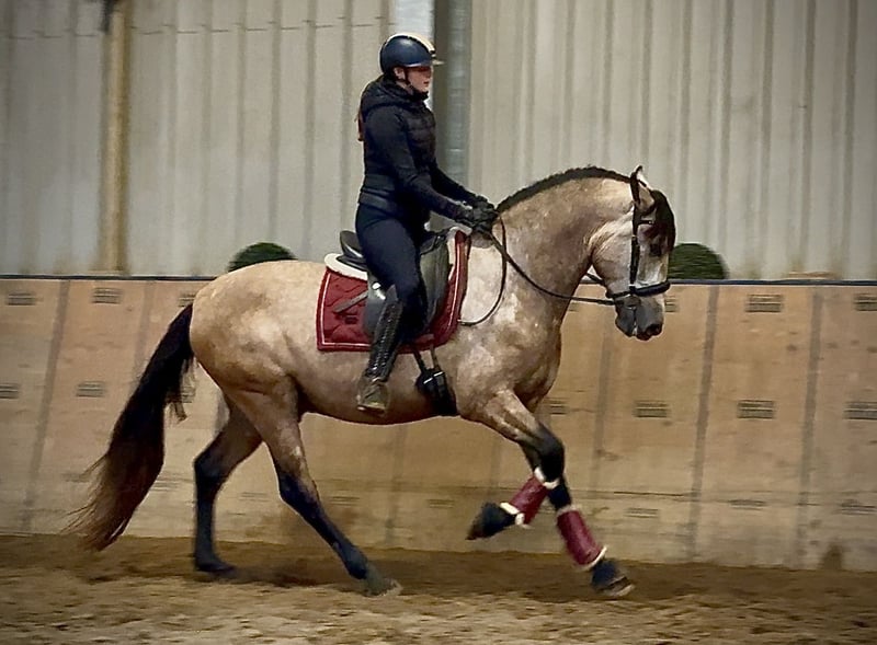 Naam: Choto Ras: Andalusiër Mix Geslacht: Ruin Geboortedatum: 21 juni 2021 Leeftijd: 4 jaar Stockmaat: 1,58 m (16.1 hh) Kleur: Falbschimmel Afstamming: niet bekend Karakter: leergierig, betrouwbaar, nieuwsgierig, intelligent, gevoelig Opleiding/geschiktheid: gereden, dressuur, recreatie, Working Equitation Buitenritervaring: betrouwbaar, onbevreesd, zowel solo als in groep Gezondheid: ontwormd, gevaccineerd, nuchter, eczeemvrij, tanden gecontroleerd, osteopathisch behandeld Stalling: box, open stal Bijzonderheden: zeer zitcomfortabel, schoeisel- en laadfaardig De genoemde eigenschappen zijn gebaseerd op onze persoonlijke inschatting en vormen geen garantie. Prijs: €7.900 (bruto prijs) Heeft u interesse? Om u een beter beeld van Choto te geven, sturen wij u graag zijn rijvideo toe. Natuurlijk staan wij voor een uitgebreide beschrijving van het paard, persoonlijk advies en het beantwoorden van al uw vragen ook telefonisch voor u klaar. U kunt ons te allen tijde een WhatsApp-bericht sturen of bellen naar: +49 151 19487595 Onze openingstijden zijn dagelijks van 07:00 tot 13:30 uur en vanaf 20:00 uur. Wij kijken uit naar uw contact! Een klinisch of röntgenologisch aankooponderzoek kan door uw eigen dierenarts worden uitgevoerd. Choto kan uiteraard veilig en comfortabel naar zijn nieuwe thuis worden gebracht. Wij regelen alle voorbereidingen en het transport, zodat uw nieuwe paard stressvrij, goed verzorgd, verzekerd en welbevinden in zijn nieuwe omgeving aankomt. Momenteel bieden wij een zorgvuldig geselecteerde collectie verkooppaarden aan. Bij ons vindt u gegarandeerd uw droompaard. Bezoek ook gerust onze website: www.marvinsroyalhorses.de Beste klanten, wij stellen u graag onze paarden voor en bieden mogelijkheden voor longeren, poetsen, opzadelen, grondwerk en proefritten in de rijhal, op de piste of in het terrein, zodat u uw nieuwe familielid beter kunt leren kennen. Dit kost €40 per paard, en voor elk extra paard €30. Bij aankoop wordt dit bedrag vergoed. Ons adres is: Grube Ferdinand 50 53577 Neustadt Wied Google Maps: marvinsroyalhorses