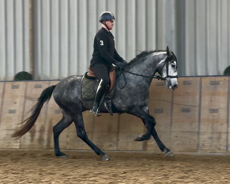 Name: Sanson-Sol Rasse: Cruzado, Kreuzung Geschlecht: Wallach Geburtsdatum: 31.03.2022 Alter: 4 Stockmaß: 1.58m Farbe: Schimmel Abstammung: ohne Abstammungsnachweis Charakter: menschenbezogen, lernwillig, neugierig, intelligent, mutig Ausbildung/Eignung: angeritten, Freizeit, Dressur, Barock, Working Equitation Geländeerfahrung: zuverlässig, unerschrocken, nervenstark, alleine und in der Gruppe Gesundheit: entwurmt, geimpft, Barhufer, ekzemfrei, Zähne kontrolliert, osteopathisch behandelt Haltung: Box, Paddock Besonderheiten: sehr sitzbequem, gute Grundgangarten, schmiede und verladefromm, herdenverträglich Die genannten Eigenschaften beruhen auf unserer persönlichen Einschätzung und stellen keine zugesicherten Merkmale dar. Preis: 6900€ (Bruttopreis) Haben wir ihr Interesse geweckt? Um Ihnen einen besseren Eindruck von Sanson zu geben, senden wir Ihnen sehr gerne sein Reitvideo zu. Selbstverständlich stehen wir Ihnen für eine ausführliche Beschreibung des Pferdes, persönliche Beratung und zur Beantwortung aller Ihrer Fragen auch telefonisch zur Verfügung. Bitte schreiben Sie uns hierfür jederzeit eine WhatsApp Nachricht, oder rufen unter folgender Telefonnummer an: +49 15119487595 Unsere Telefonzeiten sind täglich von 7:00 - 13:30 sowie ab 20:00Uhr. Wir freuen uns über Ihre Kontaktaufnahme! Eine klinische oder Röntgenologische Ankaufsuntersuchung kann gerne vom Tierarzt Ihrer Wahl durchgeführt werden. Natürlich kann Sanson sicher und komfortabel in sein neues Zuhause geliefert werden. Wir kümmern uns um alle notwendigen Vorbereitungen und den Transport, damit Ihr neues Pferd stressfrei, gut betreut, versichert und wohlbehalten im neuen Zuhause ankommt. Zurzeit präsentieren wir eine sorgfältig ausgewählte Vielfalt an Verkaufspferden. Bei uns finden Sie garantiert Ihr Traumpferd. Besuchen Sie uns auch gerne auf unserer Homepage unter: www.marvinsroyalhorses.de. Sehr geehrte Kunden, gerne stellen wir Ihnen unsere Pferde vor und führen, putzen, satteln, longieren, Bodenarbeit sowie Probereiten in der Reithalle, auf dem Platz oder im Gelände ist Ihnen möglich, um Ihr neues Familienmitglied näher kennenzulernen. Dieses kostet für ein Pferd 40€, für jedes weitere 30€ und wird beim Kauf wieder erstattet. Unsere Adresse lautet: Grube Ferdinand 50 53577 Neustadt Wied Google Maps: marvinsroyalhorses