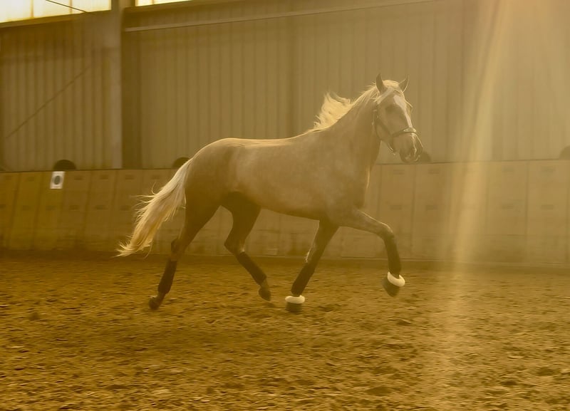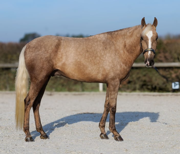 Name: Tamboril Rasse: Cruzado, Kreuzung Geschlecht: Wallach Geburtsdatum: 18.03.2022 Alter: 4 Stockmaß: 1.60m Farbe: Palomino Abstammung: ohne Abstammungsnachweis Charakter: sehr menschenbezogen, gelehrig, verlässlich, geduldig, neugierig, intelligent, mutig, gelassen Ausbildung/Eignung: geritten, Freizeit, Dressur, Barock, Working Equitataion Geländeerfahrung: zuverlässig, unerschrocken, nervenstark, alleine und in der Gruppe Gesundheit: entwurmt, geimpft, Barhufer, ekzemfrei, Zähne kontrolliert, ostheopatisch behandelt Haltung: Box, Paddock Besonderheiten: sehr sitzbequem, gute Grundgangarten, schmiede und verladefromm, herdenverträglich Die genannten Eigenschaften beruhen auf unserer persönlichen Einschätzung und stellen keine zugesicherten Merkmale dar. Preis: 9500€ (Bruttopreis) Haben wir ihr Interesse geweckt? Um Ihnen einen besseren Eindruck von Tamboril zu geben, senden wir Ihnen sehr gerne sein Reitvideo zu. Selbstverständlich stehen wir Ihnen für eine ausführliche Beschreibung des Pferdes, persönliche Beratung und zur Beantwortung aller Ihrer Fragen auch telefonisch zur Verfügung. Bitte schreiben Sie uns hierfür jederzeit eine WhatsApp Nachricht, oder rufen unter folgender Telefonnummer an: +49 15119487595 Unsere Telefonzeiten sind täglich von 7:00 - 13:30 sowie ab 20:00Uhr. Wir freuen uns über Ihre Kontaktaufnahme! Eine klinische oder Röntgenologische Ankaufsuntersuchung kann gerne vom Tierarzt Ihrer Wahl durchgeführt werden. Natürlich kann Tamboril sicher und komfortabel in sein neues Zuhause geliefert werden. Wir kümmern uns um alle notwendigen Vorbereitungen und den Transport, damit Ihr neues Pferd stressfrei, gut betreut, versichert und wohlbehalten im neuen Zuhause ankommt. Zurzeit präsentieren wir eine sorgfältig ausgewählte Vielfalt an Verkaufspferden. Bei uns finden Sie garantiert Ihr Traumpferd. Besuchen Sie uns auch gerne auf unserer Homepage unter: www.marvinsroyalhorses.de. Sehr geehrte Kunden, gerne stellen wir Ihnen unsere Pferde vor und führen, putzen, satteln, longieren, Bodenarbeit sowie Probereiten in der Reithalle, auf dem Platz oder im Gelände ist Ihnen möglich, um Ihr neues Familienmitglied näher kennenzulernen. Dieses kostet für ein Pferd 40€, für jedes weitere 30€ und wird beim Kauf wieder erstattet. Unsere Adresse lautet: Grube Ferdinand 50 53577 Neustadt Wied Google Maps: marvinsroyalhorses