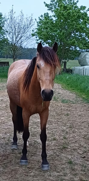 Hello, I am selling my 7-year-old, absolutely sweet, well-mannered Cruzado (Spanish) gelding. His height is approximately 1.55 meters. Amigo was correctly backed at the age of 4, including a two-month period with Ernst-Peter. He is very gentle to ride, familiar with ground work (lunging, hand work, free jumping), and even lunges well on the circle. He knows all three basic gaits and has begun working on lateral movements. Currently, he is being ridden once a week by a trainer to further refine his training. Amigo is not a heavy horse and can carry up to 70 kg. He has mostly been kept in an open stable environment and was only in a box for short periods, such as during seminars or his training with Ernst Peter. Therefore, I would prefer him to continue being kept in an open stable. In my opinion, he is suitable for pretty much anything, as he is open-minded and curious about everything. His lively walk suggests he could also be suitable as a distance riding horse. Amigo is very clear-minded and can be ridden alone in the terrain. He has been barefoot so far but is familiar with hoof boots. It is important to note that this is not an urgent sale, and he will only be sold to a good home where he will be appreciated and properly cared for. Please feel free to contact me for further information in a personal conversation.