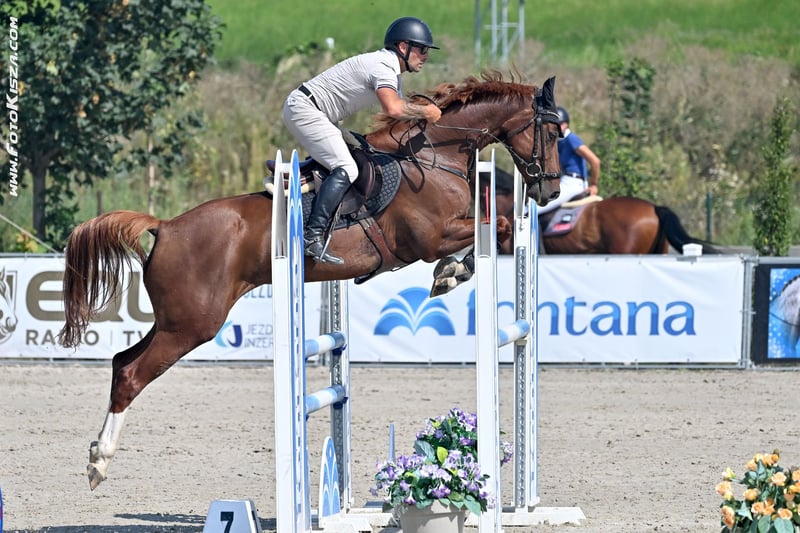 Belle et éclatante avec des reflets nacrés, jument de saut de 5 ans par Aristo (Artos x Carthago), issue d'une fille de Guidam. Précise, non peureuse, expérimentée jusqu'à 1,15 m, droite, volontaire et facile à rider. Excellent modèle pour une cavalière / Amateur / Jeune cheval.