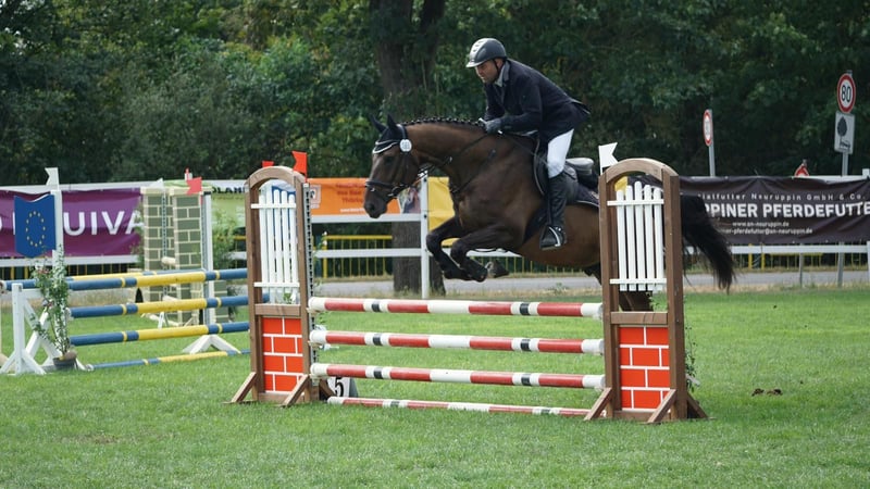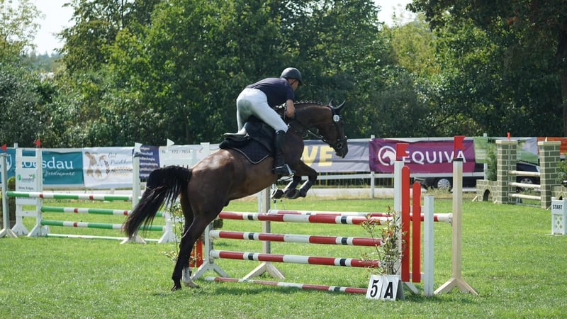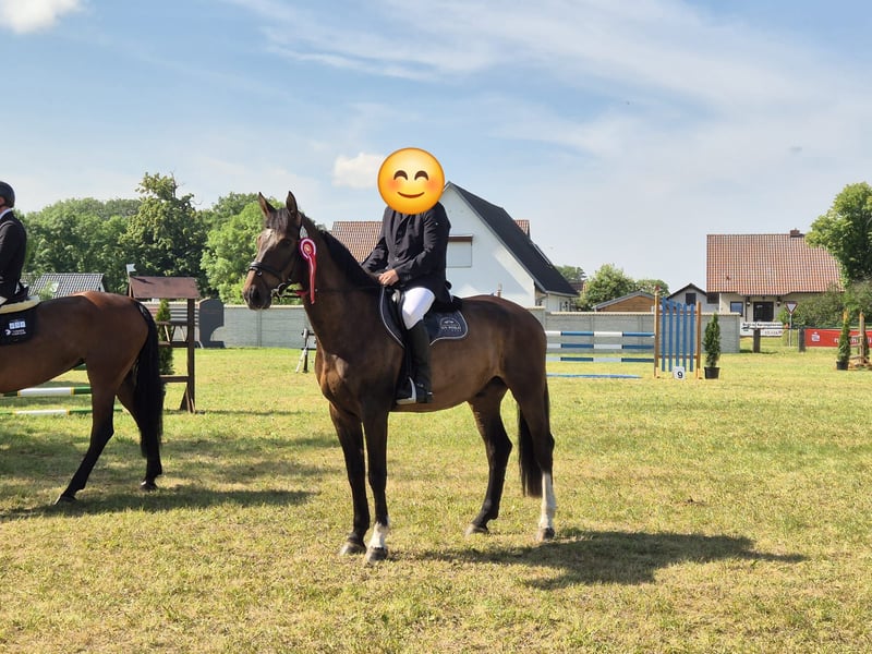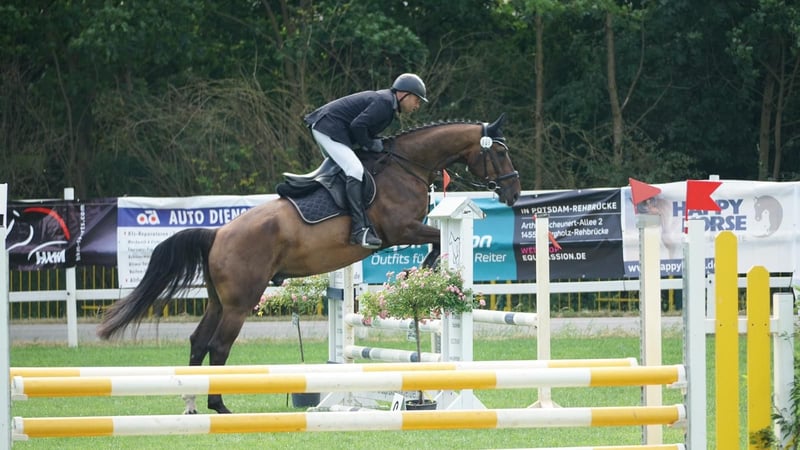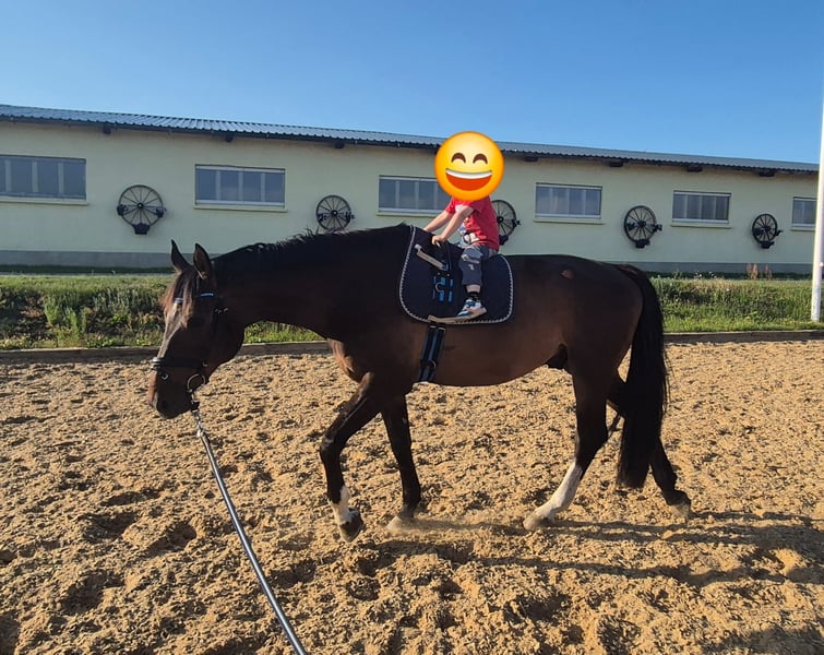 Well-trained gelding. Affectionate and reliable horse, whether in the arena, on the flat, or out in the field. He has currently won a show jumping class A and has placed multiple times. Due to his unique, loving nature, he is also suitable for beginners and re-riders as well as for families. He has never been startled or bucked with us. He is groomed alone by a 3-year-old child and reliably goes on the lunge with a vaulting girth at any time. He is always kind to handle and in every situation. Even at competitions, nothing disturbs his calm. We wish for him a home with plenty of space to move freely, social contacts, and love. To spare the horse from riding tourism, a fee of €30 applies for trial rides.