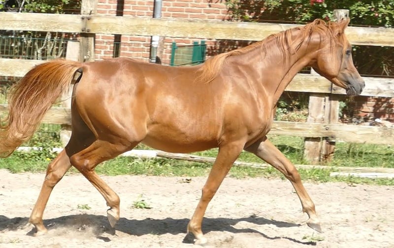 Myada is searching for her people and a meaningful task... She is a stunning young mare with a lot of presence, beautiful movement, and an excellent conformation. Her pedigree is exciting, sired by NK Nagwan out of True Mahari by True Colours. She closely resembles her dam, a successful breeding mare with show achievements, and clearly has potential in that direction. At the same time, she is cool and brave, confident, intelligent, and has a strong, well-built physique. We can easily imagine her as a Western or leisure horse as well. All our young horses are raised in an open stall from birth, weaned late and gently, and then live in groups of young horses with plenty of space. They are very well socialized, healthy, and fit. Myada has never been ill and is roughly mid to high-ranking within her group. Expected height is approximately 15.0 to 15.2 hh. She is halter-trained, familiar with the farrier, veterinarian, tractor, cars, cats, dogs, and everything else on the farm. She is gentle to handle for grooming and detangling her beautiful, long mane. Otherwise, she is still quite raw and untrained.