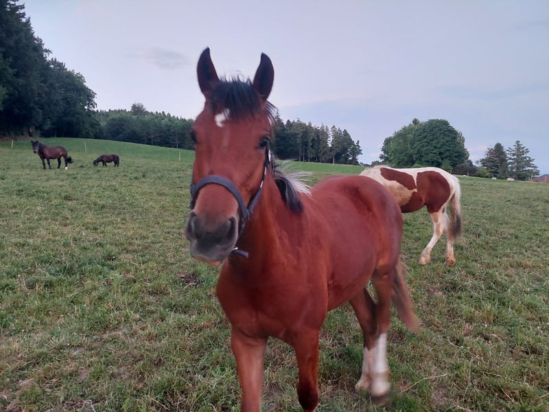 Chaya ist im April 2024 gebohren. Sie ist wunderbar Halfterführig und kennt Hufschmied. Chaya wächst in einer gemischten Herde auf von 1.5 bis 30 Jährig alles dabei. Sie kennt Kinder,Kühe, Hunde, Landwirtschaftliche Maschinen usw. Chaya ist sehr neugierig und möchte nun mehr gefordert werden. Ihre Mutter ist mit 155cm eher klein und Chaya selber wird bestimmt auch nicht grösser. Sie steht bei uns mit einer anderen 1.5jährigen Stute in einer grossen Auslaufbox und ist tagsüber mit der Gruppe auf dem Padok/Weide.