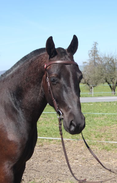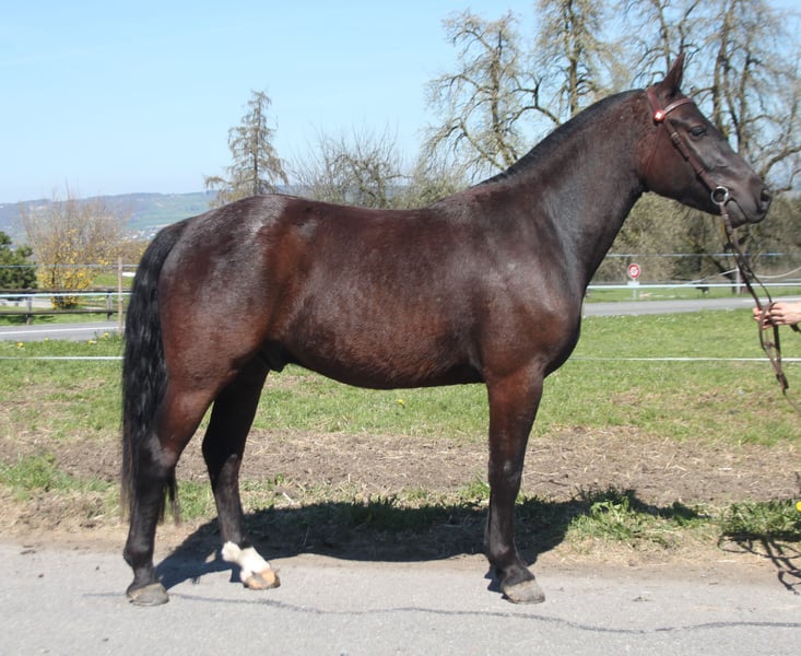 Hermoso caballo de Freiberger en pelaje oscuro. Mide aproximadamente 1,57 m. Pedigrí: Navarino / Nejack El caballo demuestra una actitud muy tranquila y serena en su manejo. Ha pasado la prueba de campo y actualmente se le está utilizando de acuerdo a su edad. Principalmente se le monta en el campo y se le conduce en carreta en tándem. También se trabaja con él en la cuerda y en el paddock de doma de forma regular. Vive en una explotación agrícola con mucho movimiento y alegría: máquinas, grandes tractores y niños jugando, todo esto forma parte de su día a día. Se encuentra en un grupo de estabulación, donde ocupa una posición intermedia en la jerarquía y muestra un carácter muy juguetón, típico de un caballo gelding.