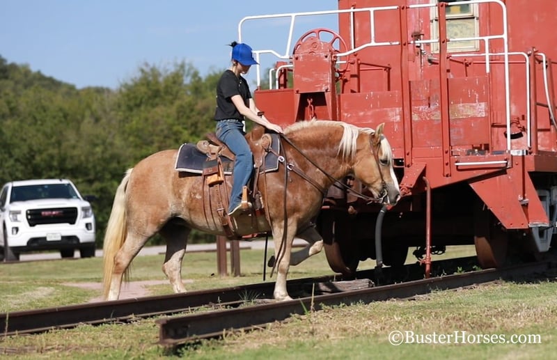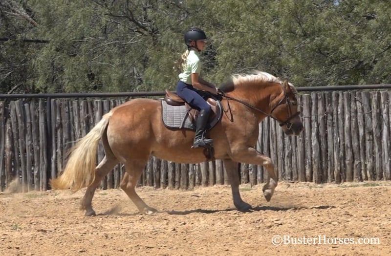 ONLINE AUCTION Place your bids at www.PlatinumEquineAuction.com Starting Bid $3500 Auction ends December 15th, 2024 Need a new saddle? Check out White Rock Saddles on our website or Facebook! “Gloria” – 14H, 8 year old chestnut Haflinger mare. We have the unique opportunity to offer a home-raised, only one-owner. beloved personal/family horse. This sweetheart has been someone’s pride and joy and she reflects that! She is an absolute doll to be around and so much fun – she is absolutely stunning – she is as wide as she is tall – literally!!! She is also gorgeous, has a beautiful head, has a ton of self-carriage and elegance, and is absolutely as shapey as one comes! Gloria is incredibly smooth gaited, easy to ride, and she is the same horse once a year – once a month – or five rides a week. She has tons of natural rate and stop, she is always happy to plant to a stop at the mention of “whoa” – but is also still very light and forward and easy off of your legs! Lots of feel, and very responsive, not one you have to “peddle” everywhere, she has a great work ethic, but is also happy to rate down and stop anytime. Gloria would be a world class entry level eventer, Hunter/Jumper, dressage. or Pony Club mount. Or she is an absolutely deluxe pleasure horse, family horse, trail horse, clinic, or competitive trail riding horse! Would also be great at the bridle-less competitions, she has lots of guide for a big girl, and her rate and stop is about as always-there, as they come in a horse! This big and wide mare is an absolute blast to ride. She loves to go places, loves trail rides, loves parades, loves going in to town – she hops right in the trailer and is always happy to go to work! She loves people, and loves to have a job. She has an absolutely incredible personality!!! She is very loving and affectionate. She gives kisses…. and smiles – on command!!! But still has very respectful, professional, tidy manners on the ground. This is one of those ultimate dream personal horses that everybody hunts down and they do not come up for sale often! Don’t miss out on Gloria! To see additional videos, go to our website: BusterHorses.com or our Facebook page Buster Horses. Check our website for buyer reviews, more videos, additional info: etc: https://busterhorses.com/Gloria Gloria was just shod this week, her teeth were also done by an equine dentist, she had her ears preemptively treated for ticks, and she was also power packed wormed. She is good to shoe, has great feet and also goes well barefoot – if her new owner prefers her to be barefoot, we can have her shoes pulled and trim her prior to her heading to her new home. She will arrive at her new home up-to-date and ready to go to work! Please call anytime for more information at 214-605-7174 Gloria is located in Weatherford, TX – one hour from Dallas / Fort Worth International Airport. She is an easy day trip or fun overnight trip to come try out, from anywhere! We are experienced, knowledgeable sellers, and we can help with quickly arranging affordable shipping to any buyer’s location – we have experience shipping worldwide – including regularly to Hawaii, Canada, Mexico, Europe, and South Africa. Check our website for buyer reviews, more videos, additional info: etc: https://busterhorses.com/Gloria ONLINE AUCTION Place your bids at www.PlatinumEquineAuction.com Starting Bid $3500 Auction ends December 15th, 2024 Need a new saddle? Check out White Rock Saddles on our website or Facebook!