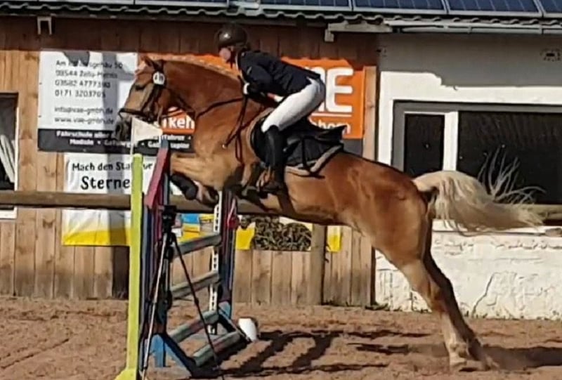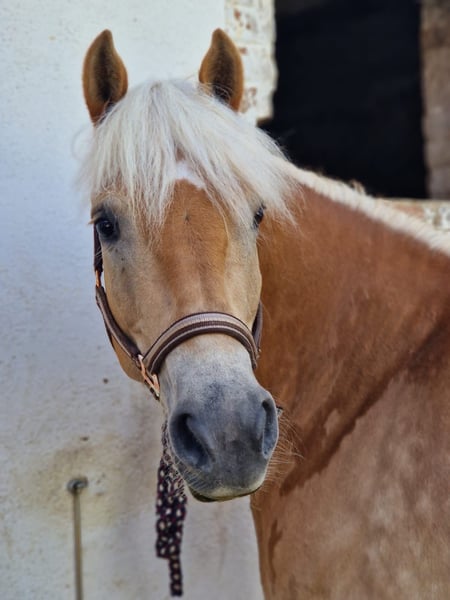 Wir suchen für unsere 12 Jährige Haflingerstute ein neues liebevolles Zuhause. Vroni ist reinerbig und von bester Abstammung. Sie ist ein sehr sportlicher Haflinger, zeigt sich unter dem Sattel sehr motiviert und hat Spaß an der Arbeit. Vroni springt sehr gut und hat daran besonders viel Freude, lässt sich aber auch in der Dressur gut reiten. Durch ihre Neugier lernt sie schnell, allerdings nicht nur gewünschte Dinge. Sie hat drei hervorragende Grundgangarten. Mit ihr wurde bisher vielseitig gearbeitet und diese Abwechslung (Bodenarbeit, Springen, Dressur, Longieren, Ausreiten) sollte sie auch in ihrem neuen Zuhause finden. Vroni kennt Kinder, Hunde, Wasser, Traktoren etc. und ist im Gelände umgänglich und gut zu händeln. Sie ist nicht ängstlich, aber dennoch auch nicht unerschrocken. Sie ist geeignet für Freizeit- und Turnierreiter, sollte aber weiter gefordert und gefördert werden. Nur ein bis zweimal die Woche bewegt zu werden, genügt ihr nicht. Gehalten wird sie im Offenstall (24/7 Koppel mit Unterstand), Vroni ist also auch herdenverträglich. Diese Haltungsform wäre für das neue Zuhause auch wünschenswert. Sie ist regelmäßig geimpft und entwurmt und auch die Zähne wurden regelmäßig gemacht. Aktuell ist sie komplett beschlagen. Probereiten gegen Schutzgebühr möglich.
