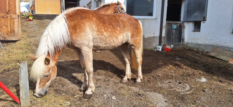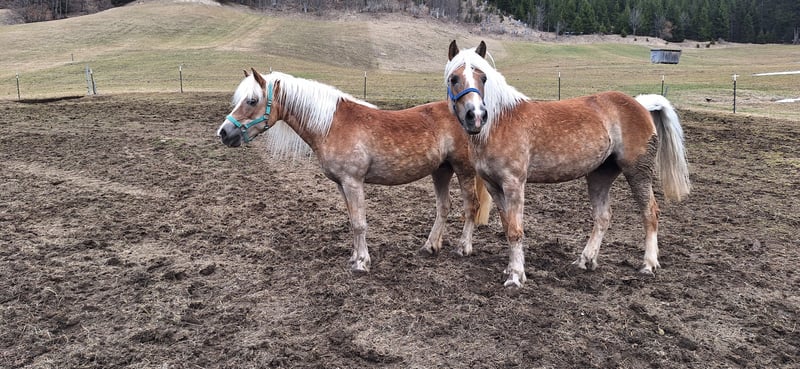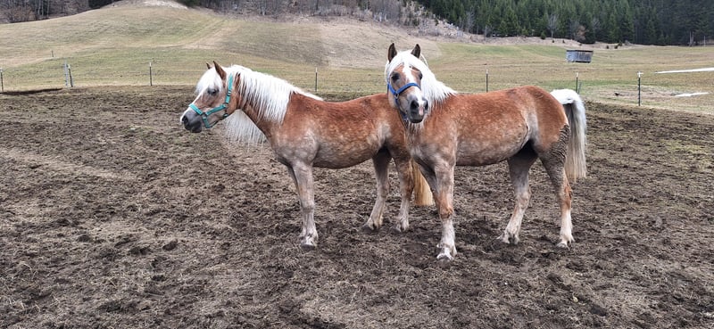 Verkaufe 2 Haflinger Stuten. Mutter 2006 und Tochter 2012 Preis ist für beide Pferde zusammen. Die beiden stehen erst seit kurzem übergangsmäßig bei mir. Sie sind sehr lieb und verschmust. Schlagen und beißen nicht. Die Mutter Stute (Denisha) wurde als junges Pferd angeritten. Sie lässt sich toll longieren auch meine Tochter ist schon drauf gesessen. Die Tochter Stute (Drisena) kam roh zu uns. Ich hab bereits begonnen sie zu longieren und war nun auch schon einmal mit ihr im Schritt im Gelände. Sie ist etwas der nervösere Typ. Dennoch sehr brav und lieb die beiden. Seni könnte evtl. Ekzemer sein aber das hat sich bei uns noch nicht gezeigt. Derzeit kann ich aufgrund meiner Verletzung nicht weiter mit Ihnen arbeiten. Sonst hätte ich schon mehr mit Ihnen gemacht. Sie sind eher was für erfahrene Pferdemenschen keine Kinder-Ponys. Aber sie machen auf jeden fall viel Freude.
