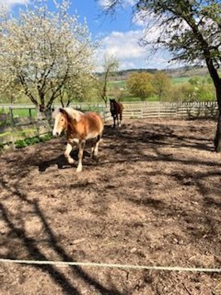 Pour la traduction en français : --- **Jument Haflinger** Née en mai 2009 Environ 1,45 m au garrot En raison du manque de temps, la jument ne reçoit plus l’attention qu’elle mérite, et sa propriétaire recherche « la perle rare » : un endroit où elle se sentira bien et où elle pourra continuer à être chouchoutée. Elle est montable, possède du punch et peut également être bien montée par des jeunes cavaliers. L’année dernière, elle a commencé à produire des rouleaux en mâchant, malgré des soins dentaires réguliers. Des radiographies ont été réalisées, il s’agit très probablement d’une arthrose de l’articulation temporo-mandibulaire. Elle ne peut plus vraiment valoriser le foin ou l’herbe, elle reçoit donc des copeaux de foin. Elle s’en sort bien avec cette alimentation, mais le nouveau propriétaire doit être conscient que cette alimentation est plus coûteuse. Elle est régulièrement vermifugée, ses dents ont été récemment traitées, et ses sabots sont entretenus à intervalles réguliers (pédicure pieds nus). Elle est facile à manipuler, actuellement en paddock avec une autre jument, connaît la pâture, le box, ainsi que le paddock d’extérieur. Elle sera vendue uniquement sous contrat d’échange contre paiement, et l’endroit sera vérifié au préalable.