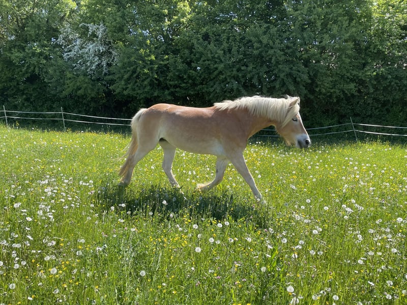 … avec un caractère vif et de superbes allures dans un type de cheval de dressage moderne, qui s’ennuie énormément ici, cherche un partenaire à sa hauteur pour partager de nouvelles aventures. Nous devons, à regret, confier cette jument à des mains bienveillantes qui pourront lui offrir beaucoup d’exercice et de mouvement. Nous aimerions la céder avec sa compagne. Étant donné qu’elles sont très différentes et que nous cherchons une bonne place pour chacune, une vente séparée est également envisageable. Il faudrait alors s’accorder pour qu’elles quittent le box en même temps, car nous n’avons pas d’autres chevaux. Les deux ont passé leur premier été en alpage. Nous les avons achetées en septembre 2021, en tant que foals ou yearlings, auprès d’un éleveur tyrolien (près d’Ebbs). Nous les avons progressivement habituées au travail à cheval, en faisant beaucoup de travail au sol et en liberté. Après environ 4 ans et demi en paddock, elles sont maintenant prêtes pour la suite de leur formation, dans notre ferme. Elles connaissent les enfants, les chiens, les véhicules agricoles, les cyclistes, etc. Lors de promenades ou de randonnées à pied en été, elles se sont montrées détendues. Malena, 5 ans, avec son petit museau : vive, espiègle (encore un peu indisciplinée), intelligente, attentive. Elle a besoin d’une personne qui ne se laisse pas impressionner par ses débuts de zézaiement et qui lui assure une activité régulière. Elle connaît le poids du cavalier au pas, au trot et au galop. Il faut encore trouver le bon centre de gravité (elle a été peu montée depuis plus d’un an, uniquement manipulée en liberté, car j’ai subi une blessure au genou lors d’une chute dans une grange, et je viens tout juste d’être opérée en mars). Ses allures sont amples et souples, elle pourrait également exceller en sport. Elle est plutôt intermédiaire dans la hiérarchie, recherche rapidement un partenaire pour être brossée, très intelligente, souhaite parfois prendre des décisions (avec vous). Bonne en équipe si on lui gagne sa confiance et si on convainc son petit caractère de Haflinger. Possibles domaines d’utilisation : loisir, dressage, attelage, élevage. Très proche des humains, elle adore qu’on la brosse ou qu’on la caresse. Malena, notre petite princesse, peut d’abord faire la difficile lors du pansage (si vous ne la grattez pas à son endroit préféré, elle peut vous faire comprendre qu’elle a été un peu gâtée), mais elle reste manipulable. Elle peut aussi laisser sortir son tempérament de jeune cheval. Avec un entraînement régulier, elle est équilibrée et très sportive. Grâce à ses origines, elle peut également convenir à la reproduction. Malena n’a pas besoin d’être exclusivement en paddock, elle a surtout besoin, à l’aube, d’un endroit où se réfugier pour échapper aux mouches et d’un entretien régulier, ce qui a été moins possible dernièrement chez nous. Tout l’équipement peut, si souhaité, être acheté à prix avantageux. Nous espérons que les bonnes personnes se manifesteront. Pour toute question sérieuse, n’hésitez pas à me contacter ! Bettina