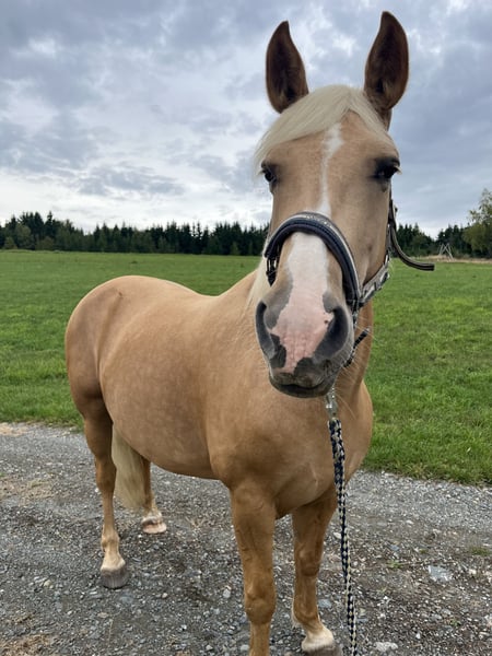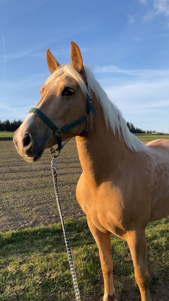 **Sales Advertisement: Beautiful Haflinger Mare for Sale** For sale is our lovely Haflinger mare Paula, born in 2018, with a height of 15.3 hands (156 cm). Paula captivates with her friendly nature and uncomplicated demeanor. She is excellent for leisurely walks and relaxed hours in the countryside. Her somewhat skittish personality makes her unsuitable for beginners, as she requires a lot of trust from her owner. She is well-trained, easy to handle, and has already gained some experience under saddle, lunging, and carrying weight on her back. Paula is healthy, vaccinated, and regularly dewormed. Additionally, she is barefoot. If you are genuinely interested or have any further questions, we look forward to hearing from you!