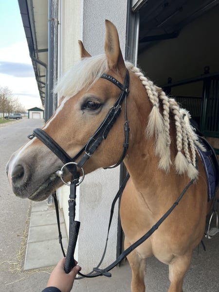 Bildschöne, typvolle Haflingerstute mit Ausdruck sucht ihre Person Wir suchen für unser 2018 geborene, ca. 142 cm große Haflingerstute Sunny einen schönen Platz, wo sie mit ihrer Bezugsperson ihr volles Potenzial entwickeln kann. Sunny ist ein absoluter optischer Hingucker und würde am liebsten von früh bis spät nur gekuschelt werden. Im Umgang ist sie ein typischer Haflinger, charakterstark, Vor allem wenn essen im spiel ist.☺️ Aktuell wird sie hauptsächlich von unserem Reitlehrerteam geritten & weiterhin ausgebildet. Sie befindet sich aktuell in der Dressur auf einem guten A-Niveau, Seitengänge wurden mit ihr begonnen & sie nimmt neues bisher sehr schnell an. Es wurden mit ihr auch schon diverse Bodenstangen & Cavaletti geritten, wobei sie sich auch geschickt anstellt, somit kann man sie zukünftig auch bestimmt ans springen heranführen. Beim reiten besticht sie durch wahnsinnig angenehme Gänge und ihre Motivation. Sie ist super leicht an der Hand. Sunny ist kein Anfängerpferd, sie wünscht sich einen sicheren & selbstbewussten Reiter. Sie ist ein schickes Freizeit-/Turnierpony für einen ambitionierten Reiter. Sie wird derzeit weiterhin ausgebildet, Preis steigt mit steigendem Könnensstand. Für weitere Infos, Videos oder Probereiten bitte per Whatsapp melden.
