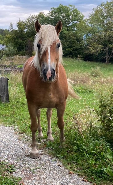 Wir verkaufen unsere 8 jährige Haflingerstute Nava aufgrund von Zeitmangel, an einen Bestplatz. 4 jährig haben wir sie von einer Alm in Slowenien gekauft, dort konnte sie im Herdenverband aufwachsen und war als 2a Zuchtstute eingetragen. Eingeritten bin ich sie dann selbst, wobei sie sehr brav war. Grundgangarten (wenig Galopp), Schenkelweichen und Halten kennt sie. Longe und Bodenarbeit auch. Ich bin sie immer ohne Sattel (mit Physiopad) geritten, da ich nie einen Passenden für sie gekauft habe. Nava ist ein sehr lernwilliges Pferd, das mehrmals die Woche gearbeitet werden will, da ihr sonst einfach langweilig ist. Sie macht nach längeren Pausen zuverlässig einige Freudenhüpfer, ist dabei jedoch nie bösartig. Wenn man sie vor dem Reiten longiert, kann sie ihre überschüssige Energie loswerden und ist dann unterm Reiter auch brav. Vor allem auf Anfänger und Kinder hat sie immer besonders gut aufgepasst, wobei sie im Umgang trotzdem einer konsequenten Führung bedarf, damit sie nicht zu stürmisch ist - deshalb wird sie nicht als Anfängerpferd verkauft. In der Herde ist sie eher ranghoch, ordnet sich aber ein und versteht sich mit Stuten und Wallachen gleichermaßen. Verletzt war sie bei mir nie, auch Hufrehe hatte sie nie. Sie ist extrem trittsicher, auch schmale Wanderwege meistert sie ganz selbstständig. Schmiedefromm. Momentan ist sie zu dick, mit rationierter Fütterung und etwas mehr Bewegung wird das schnell wieder. Durch unseren Familienzuwachs wurde sie länger nicht geritten, sollte aber nach ein paar Mal Longieren kein Problem sein. An der Longe hatte ich sie auch während meiner Schwangerschaft regelmäßig. Auf Wunsch kann ich sie vor dem Verkauf noch einige Male reiten. Dann wäre ein Probereiten im Schritt möglich, allerdings nur bei ernsthaftem Interesse. Wer bis jetzt gelesen hat, kennt meine ganz ehrliche Beschreibung zu unserer Nava. Ich denke wer sich in sie verliebt und Lust hat mit ihr zu arbeiten, mit dem geht sie durch Dick und Dünn. Deshalb wünsche ich mir für sie den passenden Menschen bei dem sie nicht zu kurz kommt! Weitere Infos und Video auf Anfrage