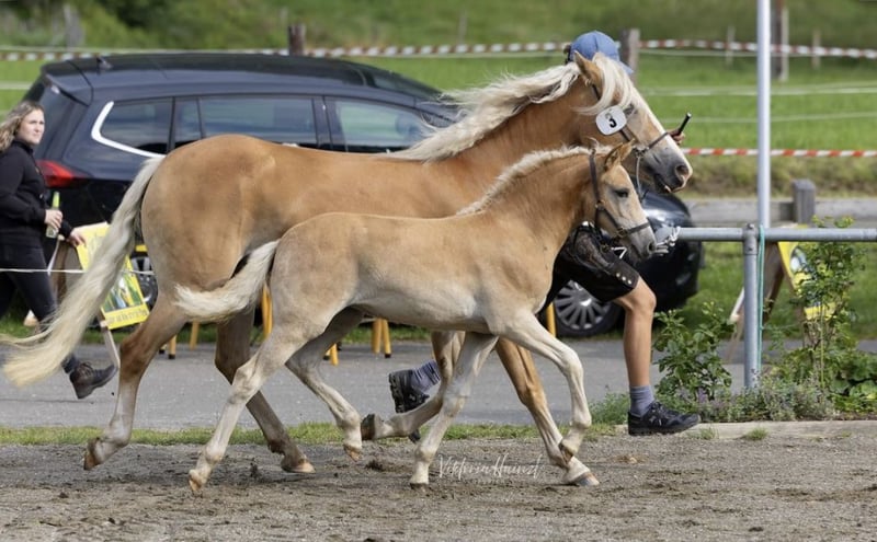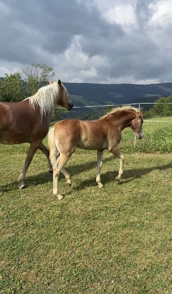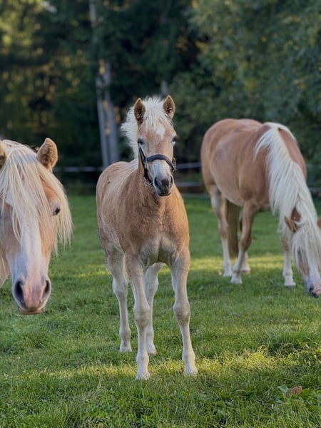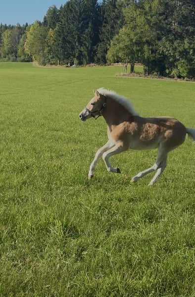 Hiermit biete ich mein am 14. Mai geborenes Haflingerstutfohlen Raya an. Sie ist ein bewegungsstarkes und charakterlich einwandfreies Fohlen. Ihre Mutter, welche ich 2021 auch als Fohlen kaufte, lernte ich durch ihren tollen Charakter und den Wahnsinns-Reitkomfort sehr zu schätzen (auf den letzten zwei Bildern ist ihre Mutter). Raya soll dem Alter entsprechend gefördert werden. Wünschenswert wäre natürlich der Einsatz in Freizeit, Sport oder Zucht. Besuche jederzeit möglich. Abgesetzt wird sie ab Dezember. Mutter: Riley-B (Winzertraum x Anton) Vater: Noakley-BE (Nachtstolz x Staniero-BE)