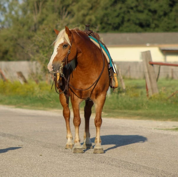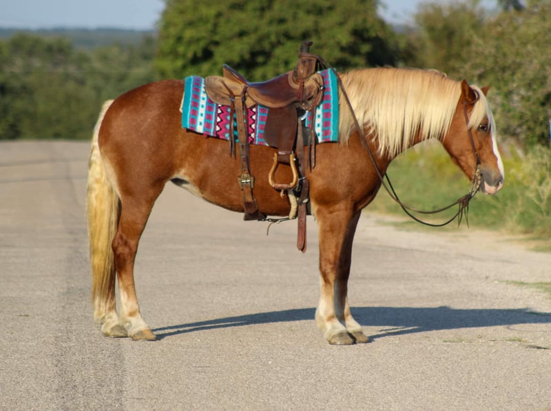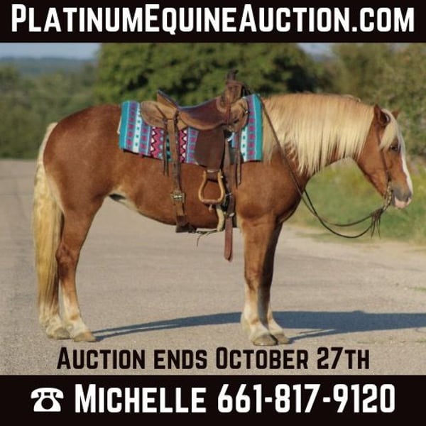ONLINE AUCTION Place your bids at www.PlatinumEquineAuction.com Starting Bid $3500 Auction ends October 27th, 2024 Need a new saddle? Check out White Rock Saddles on our website or Facebook! Twinkie is a 10 year old Haflinger mare standing 14 hds tall and as wide as she is tall . Her name says it all ! Twinkie is the ultimate two in one combo you can enjoy her hooked up to your wagon or ride her out down the trails . She will pull a cart single it has been a year since she has done that . For the past year she has been rode on many miles of trails , including weekend camping trips at the National Parks . She has a good little running walk to her and will cover some miles . She loves to be in the front of the pack to lead but will slow down and go slower if asked . She isn’t one you have to peddle down the trail the whole way which makes it nice for an easy ride on her .This girl loves to cross water , she will put it in 4X4 and go up and down any size hills you want . She will also cross bridges , logs , and tarps with no issues at all , she’s been in many types of terrain including very rocky areas . Twinkie will also ride down the road right through town with cars zooming by her she is unbothered by it . She will walk , trot and lope in the arena . She has been to a few playdays doing the events at a trot for fun by no means is she a finished playday horse but she will do it . We have carried flags and feed sacks on her . Don’t miss out on the prettiest gal in town ! If you need help with transport don’t hesitate to ask we have a list of reputable haulers that can get her safely to your doorstep world wide. Contact us to come try her, or we can set up a FaceTime also. Located in Stephenville, TX. Contact M$ Performance Horses Michelle 661-817-9120. ONLINE AUCTION Place your bids at www.PlatinumEquineAuction.com Starting Bid $3500 Auction ends October 27th, 2024 Need a new saddle? Check out White Rock Saddles on our website or Facebook!