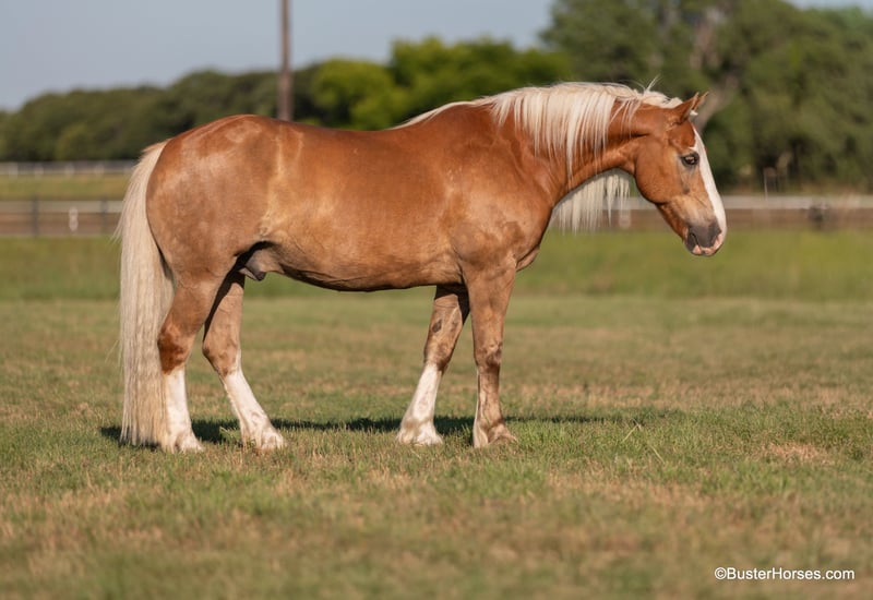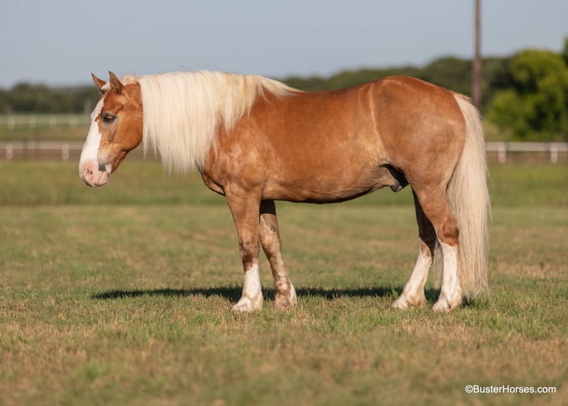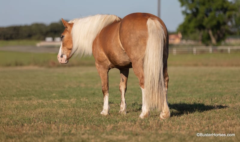 ONLINE AUCTION PLACE YOUR BIDS AT PLATINUMEQUINEAUCTION DOT COM $3500 STARTING BID AUCTION ENDS JUNE 30TH “Scooter” – 14.2H, 11 year old golden palomino/chestnut Haflinger gelding. We could sell 10 horses every single week like Scooter – we get calls asking for his kind – daily. If you want one that your kiddos ask to ride everyday and really enjoy and are relaxed riding, then don’t miss him! He is so fun, pleasant and easy. He is just the whole package that everyone is looking for in a pleasure and trail horse – he is thick made, stout, and the perfect size that is easy to saddle, easy to step up on, comfy and not intimidating for the new or the smaller riders. He measure only at 14.2H – but looks way bigger! He has a huge barrel, and he is stout and thick enough made to handle the larger riders too. Scooter has literally been to town more miles than most! He has probably been ridden to town…more than he has been home – this one is about as comfy and relaxed in commotion, traffic, and at events – as he is in his own field! He could care less what is going on around him and is as confident as they come in hectic situations. Scooter is a simple point and shoot style ride, has a great stop on “whoa”, and has incredibly smooth and easy to sit gaits. Haflingers don’t come in this color often – and rarely with all the chrome too! Scooter is gorgeous with his eye-catching light golden/almost palomino chestnut color, with his HUGE bright mane and tail – and he has the most adorable endearing personality, he is super friendly and everyone here absolutely loves him. We have not found one thing to complain about with this one, he has an exceptional disposition, is always relaxed, and has spectacular ground manners. Scooter was just shod this past week, his teeth were also done by an equine dentist last week, and he had his sheath cleaned, his ears treated for ticks, and he was also power packed wormed. He is good to shoe, has great feet and also goes well barefoot – if his new owner prefers him to be barefoot, we can have his shoes pulled and trim him prior to him heading to his new home. He will arrive at his new home up-to-date and ready to go to work! We are experienced, knowledgeable sellers, and we can help with quickly arranging affordable shipping to any buyer’s location – we have experience shipping worldwide – including regularly to Hawaii, Canada, Mexico, Europe, and South Africa. Please call Buster Horses Ashley 214-605-7174 Located in Weatherford, TX.