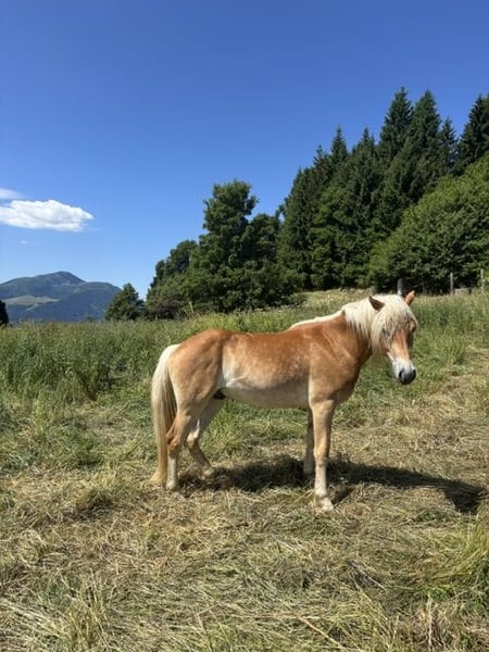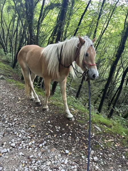 Charakter: Ausgeglichen, sensibel und sehr kooperativ. Er ist an den täglichen Kontakt mit Menschen, Kindern und anderen Pferden, auch Fohlen, gewöhnt. Er ist ruhig im Stall und im Umgang stets respektvoll. Er ist zuverlässig bei der Pareggiatura. Den Sommer verbrachte er in der Alm, wo er ein- bis zweimal auf dem Rücken ausging, um das Training aufrechtzuerhalten. Ausbildungsstand: Kürzlich eingeritten, aber von Anfang an sehr kooperativ und höflich. Er arbeitet beständig im Schritt, Trab und Galopp; kennt die Arbeit am Boden gut und verhält sich auch beim Spaziergang sehr gut, sowohl alleine als auch in der Gruppe. Eignung: Hervorragendes Freizeitpferd, für Trekking und Bergwanderungen geeignet; ideal für Hobbyreiter oder Familien, die nach einem zuverlässigen Haflinger mit solider Grundausbildung suchen. Gesundheitszustand: In perfektem Gesundheitszustand, regelmäßig geimpft und tierärztlich betreut.