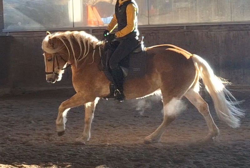 4 jähriger Haflingerwallach, super lieb, im Umgang ein echter Schatz, rittig und will immer gefallen. Zur Zeit 150cm - wächst noch. Super Einstellung bei der Arbeit, will immer alles richtig machen. Für alle Sparten geeignet. Wurde Western angeritten dann auf Englisch umgestellt. Hat eine super geschlossene Galoppade und ist sehr sitzbequem. Macht einfach Spaß in zu reiten.