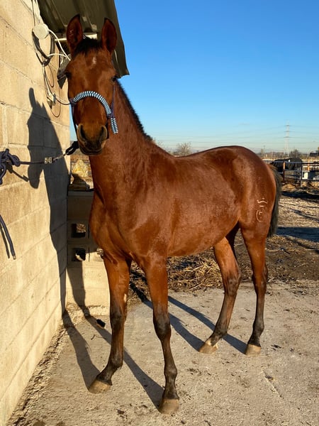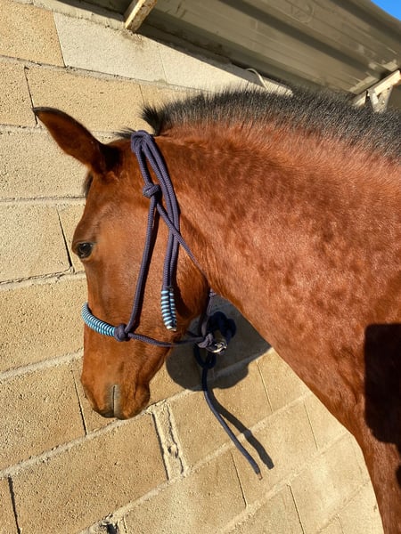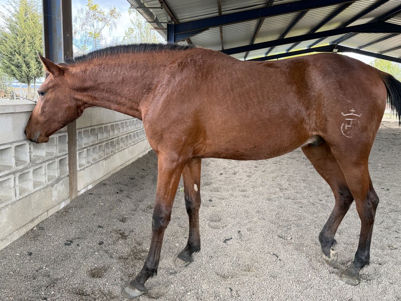 Potro hispano árabe al 34,38%. Castaño 1.54cm 21 meses Entero Potro noble, ramaleado, doma de cuerda, buen trabajo pie a tierra. Buenos movimientos. Con mucho hueso