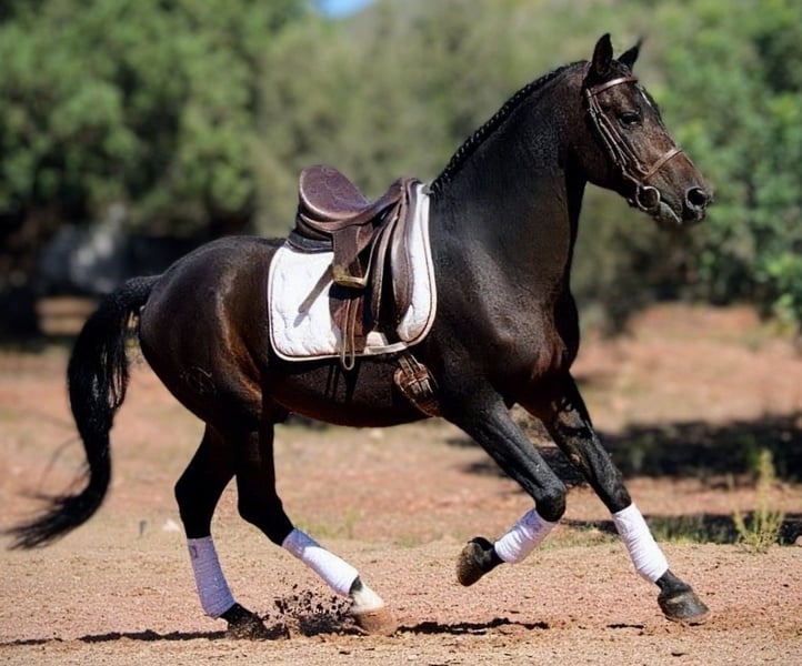 TROYA... a Hispano-Arabian gelding, is looking for his **forever home**. This stunning 7-year-old dark bay, standing at 16.1 hh, is perfect for the discerning leisure rider but also an ideal teacher for those re-entering the sport or for beginners. This elegant fellow impresses with his friendly nature and versatile suitability for leisure riding, dressage, or working equitation. He is very well-behaved in handling and extremely reliable in the field, bringing a wealth of experience to outdoor rides. In the arena, he is ideal for experienced riders seeking a noble, well-mannered, and balanced horse, but also suitable for novice riders who need a calm and steady partner. He prefers to go with a snaffle bit and is also trained in dressage with a double bridle. Troya adapts well to different training styles and can move forward confidently or softly and gently, depending on the rider’s needs. If this impressive black gelding appeals to you, please contact me with your phone number so I can get in touch as soon as possible. We always have a great selection of various Spanish horses, all from the best and most caring hands. For inquiries or more information, I am happy to assist. Visits can be arranged by appointment.