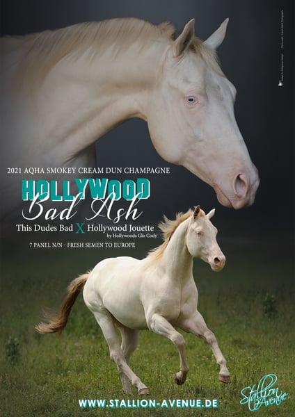 HOLLYWOOD BAD ASH jest tym, czym wyobrażasz sobie wszechstronnego konia. Wspaniały ogier o mega ekspresji, super budowie i mocnych suchych podstawach - najlepsze predyspozycje dla wybitnego wszechstronnego konia wierzchowego! Jego natura charakteryzuje się solidnym, spokojnym charakterem i równym temperamentem. Niemniej jednak nie jest stoicki, ale uważny i chętny do działania, po prostu wyluzowany i zrelaksowany. Solidna hodowla w Południowej Dakocie, charakteryzująca się doskonałymi strukturami stada, daje temu ogierowi zdrowie i odporność, które przewijają się przez jego genetykę! Te linie Foundation Ranch Horse przemawiają zatem do każdego właściciela klaczy, który myśli o hodowli bardziej wytrzymałych, zdrowszych Quarter Horses. Ponadto, ten doskonały ogier jest połączony z mega kombinacją kolorów i dlatego jest również bardzo ekscytujący dla wszystkich hodowców koni kolorowych! Smokey Cream Dun Champagne - oznacza: homozygotyczny czarny, homozygotyczny kremowy i niesie gen Dun i Champagne i jest 7 panelem N/N !!!!