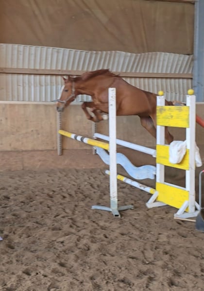 Cassy is a 10-year-old chestnut mare, standing at 16.1 hh. Her pedigree is unfortunately unknown. In recent years, she has been ridden mainly for leisure. However, it became clear that the mare needs consistent work with a rider who can handle her occasional testing behavior. In the field, she has some go but remains manageable. She has been in professional training for a few weeks, during which groundwork and jumping have been introduced. She shows a lot of enthusiasm and talent for these disciplines. Cassy is barefoot and in overall good health. No recent veterinary certificate is available. She has not yet been registered for competition. Location: 32425 Minden Videos available upon request via WhatsApp at 017670349915.