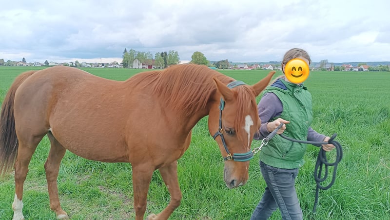 Emmi ist 12 Jahre alt und ca. 1,55m groß. Im Pass ist sie als Großpferd ohne Rassebezeichnung eingetragen; sie hat wohl einen größeren Araber-Anteil. Die "Zimtschnecke" ist sehr lieb und anhänglich, hat aber auch die nötige Würze in ihrem Temperament. Bei den Vorbesitzern stand sie in einer Box und wurde englisch geritten. Wir haben sie im Februar 2025 gekauft, aber bisher nur vom Boden aus mit ihr gearbeitet, da wir noch nicht so sicher im Reiten sind. Sie steht in einem Aktivstall, die viele Bewegung dort tut ihr gut. Anfangs war sie schreckhaft, aber das hat sich sehr gut gelegt. Im Training reagiert sie sehr fein und möchte alles richtigmachen. Wir waren auch viel spazieren mit ihr, sie läuft sehr zügig und sicher im Gelände, hat sich nie losgerissen. Sie ist barhuf, gechipt & geimpft, Zähne wurden erst im Herbst gemacht, und die Physio hat 2 Checks gemacht. Aus familiären Gründen müssen wir uns leider schon wieder von ihr trennen. Wir würden uns wünschen, dass sie im Aktivstall Schwabhof in Genderkingen bleibt oder in ihrem neuen Zuhause erst Zeit für die Eingewöhnung und Muskelaufbau zum Reiten bekommt. Zusätzlich kann auch ihr Zubehör verkauft werden, darunter ein ganz neues Signum-Paddle. Bei Interesse gerne anschreiben.