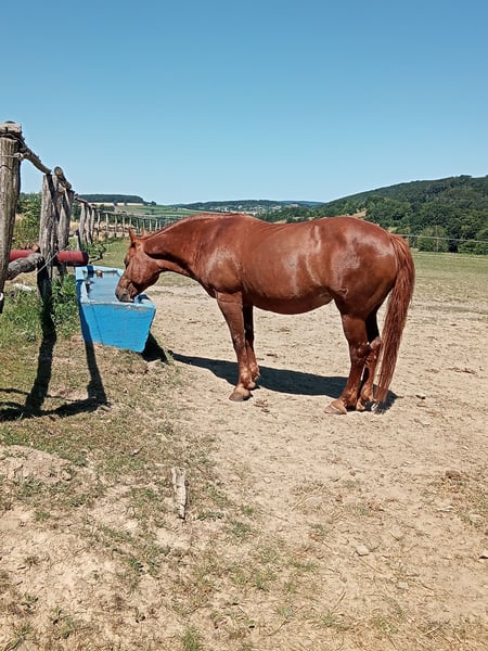 Honeymoon („Honey“) – liebevolle 27-jährige Westernstute sucht Platz mit Zeit & Herz Honeymoon ist eine 27-jährige Stute, die sich über mehr Aufmerksamkeit und Beschäftigung freuen würde. Sie wird westerngeritten (WRC-Niveau), liebt Bodenarbeit und Trail und ist sehr menschenbezogen. Aufgrund ihres Alters sollte auf softe, altersgerechte Belastung geachtet werden – bei entsprechender Rücksichtnahme ist sie aber weiterhin gut reitbar. Früher waren wir viel ausreiten und haben regelmäßig Bodenarbeit gemacht. Leider fehlt mir seit längerem die Zeit, ihr das in dem Umfang zu bieten, den sie verdient und der ihr gesundheitlich gut tun würde. Deshalb wünsche ich mir für Honey einen Menschen, der sich nicht mehr komplett verausgaben möchte, aber dennoch ausreichend Zeit und Freude an einer vielseitigen, liebevollen Beschäftigung mit einem lieben Pferd hat. Erfahrene Pferdemenschen gewünscht, da Honey in neuen Situationen unsicher ist und jemandem an ihrer Seite braucht der ihr Ruhe und Sicherheit vermittelt. Ich habe Honey seit über 15 Jahre und wünsche mir das Beste für sie! Pflege & Haltung: pflegeleicht steht im Offenstall Gesundheit & Fütterung: Honey hat EMS bei rationierter Fütterung keinerlei Beschwerden seit über einem Jahr keine Weide, seitdem gesundheitlich stabil Hufe: vorne beschlagen Sonstiges: In der Herde ist Honey eher ranghoch Platz geht vor Preis komplettes Zubehör wird mitgegeben: Sattel, Zaumzeug, Bodenarbeitsmaterial, Decken u.v.m. Wenn du mehr über Honey erfahren möchtest oder dir vorstellen kannst, ihr ein liebevolles Zuhause zu geben, melde dich gerne bei mir.