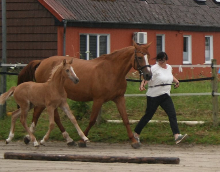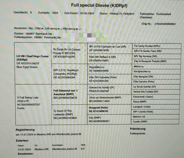Introducing Full Special Diavee, a truly exceptional filly. She is sired by Soel'rings Cuvee (Casino Royal) out of Full Swing Lady (Diamant de Semilly / Burggraaf). In daily handling, she is incredibly friendly and confident! She is equipped with excellent conformation and a correct exterior. She was awarded a remarkable 8.2 during her foal registration inspection. Her dam, Full Swing Lady, descends on the sire’s side from Diamant de Semilly and on the dam’s side from Burggraaf, which traces back to Cor de la Bryère. Full Swing Lady, herself standing at 1.70 m, passes on her good size, so her expected final height is around 16.1 hh. Great-grandfather Diamant de Semilly has been one of the top breeding sires on the WBFSH rankings for years – and rightfully so. With numerous internationally successful show jumping horses, Diamant de Semilly remains highly influential in the sport today. Notably, a large number of his offspring qualify for the Bundeschampionate and often reach final placements. His progeny demonstrate a strong aptitude for show jumping, as evidenced by over 30 descendants with a Jumping RPI above 90. Great-grandfather Burggraaf was successful internationally under Roelof Bril. In 1991, he jumped over a 2.10 m high wall in a puissance competition. Burggraaf sired offspring with excellent movement and outstanding character. This is why Burggraaf also produces dressage horses, such as the Grand Prix dressage horses Florijn and Louisville, and as the grandsire of Dressage Horse of the Year Kingston (Voltaire x Burggraaf). Burggraaf is a true producer of sport horses. Sire Soel'rings Cuvee completed his 30-day test in Munich-Riem in 2015, impressing in all evaluation criteria. At the 2015 licensing of the Schleswig-Holstein Horse Breeding Association, he received the title of Breed Winner. He combines a top performance-oriented pedigree—featuring Casino Royale FS, Champion De Luxe, and Top Nonstop, two top sires with international dressage success—with excellent basic gaits and a truly wonderful character. With this special and versatile bloodline combination, our beauty is sure to appeal to ambitious riders. Full Special Diavee is very people-oriented, growing up in a herd with other foals. She is well integrated into the herd’s middle ranks. Leading and haltering her is no problem, and she loves being groomed.