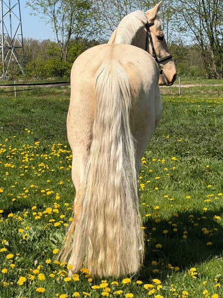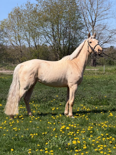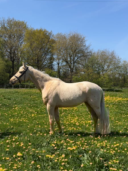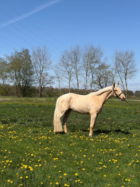 Zum Verkauf steht unsere bezaubernde Stute Primabella, geboren am 08. Mai 2022. Mit ihrem edlen Palomino-Fell, einem aktuellen Stockmaß von ca. 1,60 – 1,62 m und ihrer freundlichen, menschenbezogenen Art ist sie ein echter Hingucker. Primabella stammt väterlicherseits von dem berühmten Hengst Krem ab und überzeugt nicht nur durch ihre Abstammung, sondern auch durch ihre sehr guten Grundgangarten und ihr angenehmes Wesen. Sie ist bereits gut anlongiert und kennt das Arbeiten mit Sattel, zeigt sich dabei aufmerksam, lernwillig und brav. Durch ihren liebevollen Charakter kommt sie bestens mit Menschen sowie Tieren aller Art zurecht und ist im täglichen Umgang unkompliziert und verschmust. Primabella eignet sich hervorragend als zukünftiges Freizeit-, Dressur- oder Familienpferd und bringt beste Voraussetzungen für eine weitere Förderung mit. Bei ernsthaftem Interesse freuen wir uns über eine Nachricht. Ein Kennenlernen ist nach Absprache jederzeit möglich.