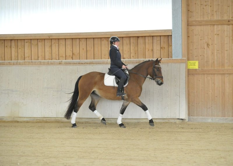 A very steady, friendly bay mare, easy to ride and uncomplicated in her overall demeanor. Experienced in the outdoor and not spooky. With a kind heart. A wonderful all-round mare for dressage, leisure riding, and trail riding.