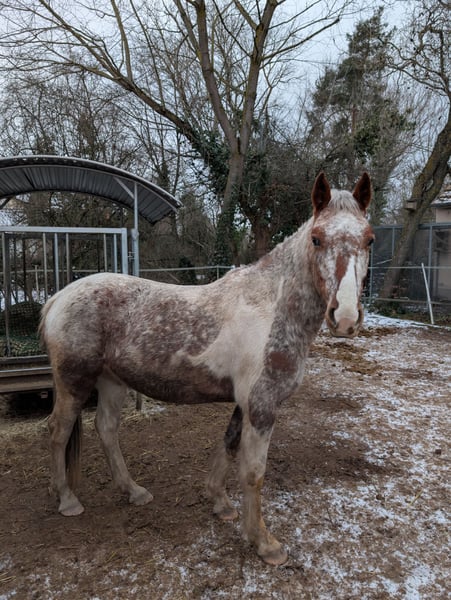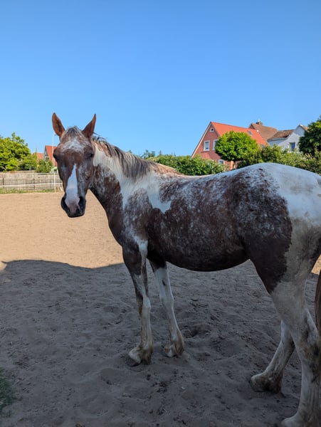 Flocke ist eine 4,5 jährige Stute mit einem Stockmaß von 150 cm. Sie lebt im Offenstall was wir uns auch weiterhin wünschen. Läuft barhuf und lässt sich überall anfassen. Tierarzt und Hufschmied sind auch kein Problem. Sie wurde bisher nur auf dem Platz gearbeitet, Gelände muss daher erst mit ihr geübt werden. Sie kennt Sattel und Reitergericht, das macht sie alles super brav mit. Sie braucht eine konsequente Hand, da sie ab und an auch testet ob du es auch ernst meinst. War bisher immer gesund. Ein Probereiten ist nur bedingt möglich, da wir nur einen kleinen Platz haben.