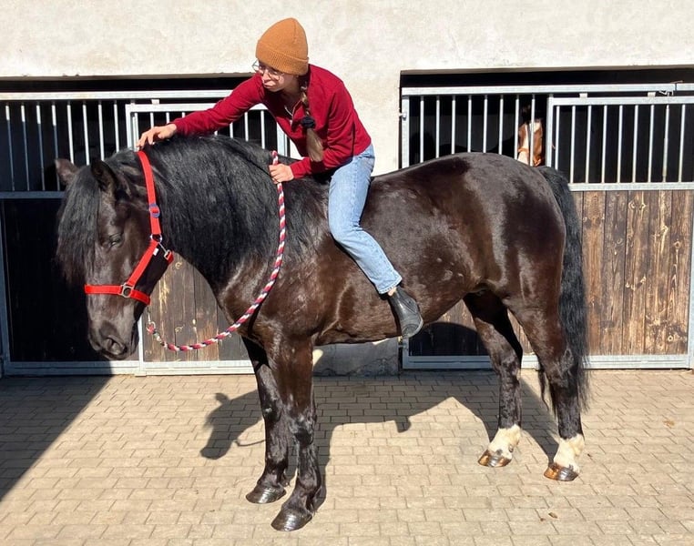 Zum Verkauf steht eine 6-jährige Rappstute vom kräftigen Typ mit einem Stockmaß von ca. 160 cm. Sie ist kompakt gebaut, gut bemuskelt und sehr tragfähig – somit auch für einen etwas schwereren Reiter bestens geeignet. Die Stute ist korrekt angeritten und sicher in den drei Grundgangarten zu reiten. Sie zeigt sich brav, ruhig und zuverlässig und ist daher auch für Kinder sowie weniger erfahrene Reiter unter fachkundiger Anleitung geeignet. Im Gelände ist sie absolut unkompliziert, geht sowohl alleine als auch in der Gruppe und zeigt sich dabei nicht schreckhaft. Andere Nutztiere kennt sie und reagiert stets gelassen. In der Herde ist sie sozial und verträglich mit anderen Pferden. Eine angenehme, ausgeglichene und vielseitige Stute, die sich ideal als Freizeit- und Familienpferd sowie für die tägliche Arbeit eignet. Standort: Polen, ca. 70 km von Görlitz entfernt (ca. 40 Minuten). Transport: möglich.