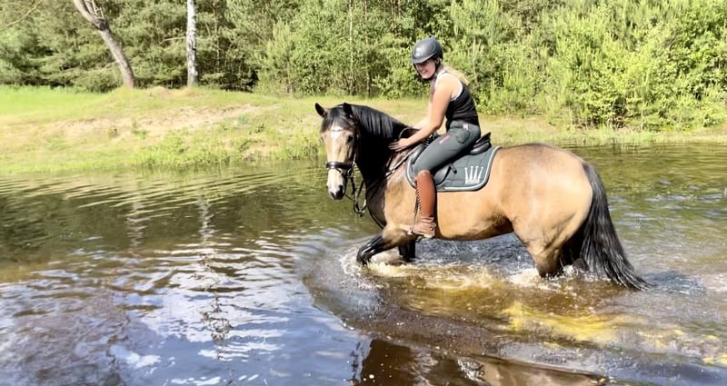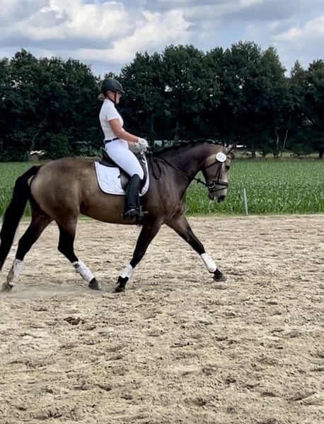 Beautiful 6-year-old buckskin mare, dark in winter, shimmering gold in summer. A horse for all disciplines of riding. Selene is very comfortable to sit on, enjoys jumping and going out on trails, is traffic-safe, and also likes Working Equitation. She is trained to A-level in dressage. She has a rather strong build, forgives rider mistakes, and can be ridden by anyone. An absolutely down-to-earth horse, healthy, with great hooves, barefoot, loads onto the trailer by herself, well-behaved with the farrier and veterinarian. Dewormed and vaccinated. Versatile basic training. She is kept in a mixed herd. It is very difficult for us to sell this beautiful horse, and she will only be sold to the best hands due to downsizing. No dealers. To prevent riding tourism, we charge €30 for trial rides, which will be deducted from the sale price.