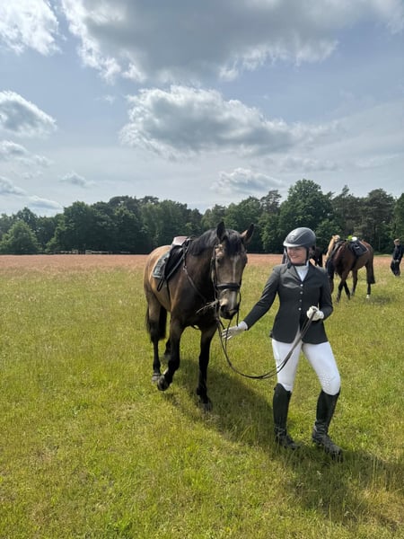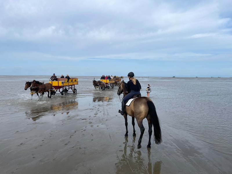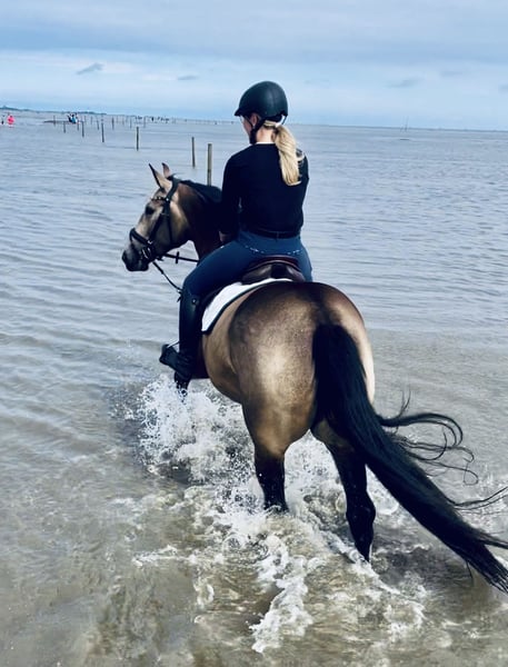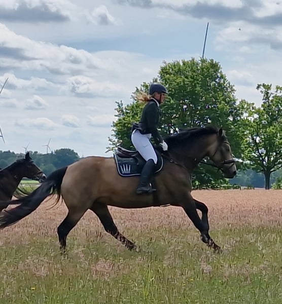 Wer ein super liebes, vielseitiges Pferd sucht, ist bei Leni genau richtig. Sie ist ein Goldschatz, was ihre Farbe auch genau beschreibt (Buckskin). Mit ihren erst 6 Jahren ist sie super brav im Gelände, egal ob Auto, Trecker, LKW oder Motorrad, sie ist immer gelassen. Wir waren mit ihr schon am Meer, im Watt, in der Heide, im Wald und im Sommer natürlich auch auf Stoppelfelder. In der Dressur befindet sie sich auf solidem A-Niveau. Ein bisschen Turnierluft durfte sie auch schon erfahren, hier sind wir dreimal in einem E-Springen gestartet. Sie ist von jedermann zu reiten und verzeiht auch Reiterfehler, deshalb ist sie auch für Reitanfänger geeignet. Natürlich ist sie Schmiede-/ Verladefromm, beim Tierarzt ist sie auch sehr brav. Sie ist geimpft und entwurmt. Wir suchen für sie das allerbeste neue Zuhause, und verkaufen sie nur wegen Bestandsverkleinerung. Um Reittourismus vorzubeugen, nehmen wir 30€ für das Probereiten.